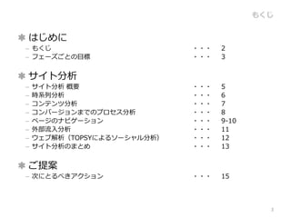 もくじ ・・・ 2 – フェーズごとの目標 ・・・ 3 サイト分析 – サイト分析 概要 ・・・ 5 – 時系列分析 ・・・ 6 – コンテンツ分析 ・・・ 7 – コンバージョンまでのプロセス分析 ・・・ 8 – ページのナビゲーション ・・・ 9-10 – 外部流入分析 ・・・ 11 – ウェブ解析(TOPSYによるソーシャル分析) ・・・ 12 – サイト分析のまとめ ・・・ 13 ご提案 – 次にとるべきアクション ・・・ 15 2