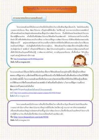 ความถนัดและความสามารถของผูเ้ รี ยน โดย วิธีการทางวิทยาศาสตร์ โครงงานจึงเป็ นกิจกรรมการเรี ยนรู ้ที่มีการเน้นผูเ้ รี ยนเป็ นสาคัญ โดยผูเ้ รี ยนจะหาหัวข้อโครงงาน ที่ตนเองสนใจ รวมทั้งเชื่อมโยงความรู ้ต่าง ๆ และความรู ้ดานคอมพิวเตอร์และเทคโนโลยีสารสนเทศ เพื่อสร้างผลงานตาม ้ ความต้องการได้อย่างเหมาะสม โดยมีครู เป็ นที่ปรึ กษาและให้คาแนะนา ความสามารถที่เกิดจากการทาโครงงานคอมพิวเตอร์ โครงงานคอมพิวเตอร์เป็ นกิจกรรมการเรี ยนรู ้ที่ทาให้ผเู ้ รี ยนเกิดความสามารถในด้านต่าง ๆ ที่สาคัญ 5 ประการ ดังนี้ 1.ความสามารถในการสื่อสาร เป็ นความสามารถที่เกิดจากการที่นกเรี ยนเป็ นผูทาโครงงานต้องนาเสนอผลงานให้ ครู และ ั ้ เพื่อนนักเรี ยนให้เข้าใจโครงงานคอมพิวเตอร์ได้อย่างชัดเจน ดังนั้น ผูทาโครงงานต้องสื่ อสารความคิดในการสร้างสรรค์ ้ โครงงานด้วยการเขียน หรื อด้วยปากเปล่า รวมทั้งเลือกใช้รูปแบบของสื่ ออย่างมีประสิทธิภาพเพื่อนาเสนอแนวคิดในการ จัด โครงงานให้ผอื่นได้เข้าใจ ู้ 2.ความสามารถในการคิด ซึ่งผูเ้ รี ยนจะมีการคิดในลักษณะต่าง ๆ ดังนี้ ่ 1. การคิดวิเคราะห์ เกิดจากการที่ผเู ้ รี ยนต้องวิเคราะห์ปัญหาและแยกแยะสาเหตุวาเกิดเนื่องจากอะไร 2. การคิดสังเคราะห์ เกิดจากการที่ผเู ้ รี ยนต้องนาความรู ้ต่าง ๆ ที่เรี ยนมา รวมทั้งความรู ้จากการค้นหาข้อมูล เพื่อใช้ใน การแก้ปัญหาหรื อการสร้างสรรค์โครงงาน 3. การคิดอย่ างสร้ างสรรค์ เกิดจากการที่ผเู ้ รี ยนนาความรู ้มาสร้างสรรค์ผลงานใหม่ ๆ 4. การคิดอย่ างมีวจารณญาณ เกิดจากการที่ผเู ้ รี ยนได้มีการคิดไตร่ ตรองว่าควรทาโครงงานใดและไม่ควรทาโครง งาน ิ ใด เนื่องจากโครงงานที่สร้างขึ้นอาจส่งผลกระทบต่อสังคมโดยรวม เช่น โครงงานระบบคานวณเลขหวย สาหรับหา เลขที่คาดว่าสลากกินแบ่งรัฐบาลจะออกในแต่ละงวด อาจส่งผลกระทบต่อสังคม ทาให้คนในสังคมเกิดความหมกมุ่น ในกับการใช้เงินเล่นหวยมากขึ้น 5. การคิดอย่ างเป็ นระบบ เกิดจากการที่ผเู ้ รี ยนคิดแก้ปัญหาอย่างเป็ นขั้นตอน โดยใช้ข้ นตอนในการพัฒนาโครงงาน คือ ั ผูเ้ รี ยนเป็ นผูวางแผนในการศึกษา ค้นคว้า เก็บรวบรวมข้อมูล พัฒนา หรื อประดิษฐ์คิดค้นผลงาน รวมทั้งการสรุ ปผล ้ และการนาเสนอผลการศึกษาค้นคว้าด้วยตนเอง โดยมีผสอนและผูทรงคุณวุฒิเป็ นผูให้คาปรึ กษา ู้ ้ ้ 3.ความสามารถในการแก้ปัญหา เกิดจากการที่ผเู ้ รี ยนวิเคราะห์ปัญหา เข้าใจ และอธิบายปั ญหาทางด้านคอมพิวเตอร์ รวมทั้งประยุกต์ความรู ้ ทักษะ และการใช้เครื่ องมือที่เหมาะสมกับการแก้ไขปั ญหา 4.ความสามารถในการใช้ ทกษะชี