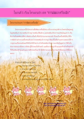 โครงงานประเภท “การพัฒนาเครื่องมือ” โครงงานประเภท “การพัฒนาเครื่องมือ” โครงงานประเภทนี้เป็นโครงงานเพื่อพัฒนาเครื่องมือช่วย สร้างงานประยุกต์ต่างๆ โดยส่วนใหญ่จะอยู่ ในรูปซอฟต์แวร์ เช่น ซอฟต์แวร์วาดรูป ซอฟต์แวร์พิมพ์งาน และซอฟต์แวร์ช่วยการมองวัตถุในมุมต่างๆ เป็น ต้น สาหรับซอฟต์แวร์เพื่อการพิมพ์งานนั้นสร้างขึ้นเป็นโปรแกรมประมวลคา ซึ่ งจะเป็นเครื่องมือให้เราใช้ใน การพิมพ์งานต่างๆบนเครื่องคอมพิวเตอร์ ส่วนซอฟต์แวร์การวาดรูป พัฒนาขึ้นเพื่ออานวยความสะดวกให้การ วาดรูปบนเครื่องคอมพิวเตอร์ให้เป็นไปได้ โดยง่าย สาหรับซอฟต์แวร์ช่วยการมองวัตถุในมุมต่างๆ ใช้สาหรับ ช่วยการออกแบบสิ่งของ อาทิเช่น ผู้ใช้วาดแจกันด้านหน้า และต้องการจะดูว่าด้านบนและด้านข้างเป็นอย่างไร ก็ให้ซอฟต์แวร์คานวณค่าและภาพที่ควรจะเป็นมาให้ เพื่อพิจารณาและแก้ไขภาพแจกันที่ออกแบบไว้ได้อย่าง สะดวก ตัวอย่างหัวข้อโครงงาน ได้แก่ 1. โปรแกรมการค้นหาคาภาษาไทย 2. โปรแกรมอ่านอักษรไทย 3. โปรแกรมวาดภาพสามมิติ 4. โปรแกรมบีบอัดข้อมูล 5. โปรแกรมประมวลผลคาไทยบนระบบปฏิบัติการลีนุกซ์ แหล่งข้อมูล : http://namkwanmay.wordpress.com http://krumewstp.wordpress.com