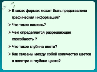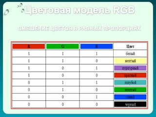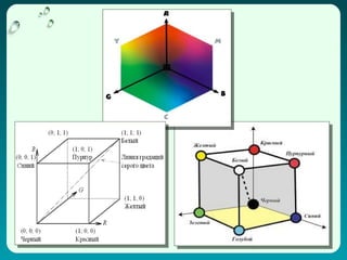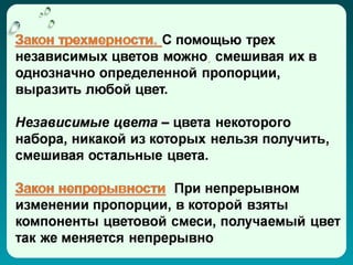 Документ содержит информацию о характеристиках цвета, включая яркость, насыщенность и цветовой оттенок, а также цветовые модели, такие как HSB и RGB. Он обсуждает теоретические основы смешивания цветов и включает задачи и вопросы для самостоятельного изучения. Также упоминаются видеокарты, подходящие для работы с разрешением 800×600 пикселей и 16-битным цветом.