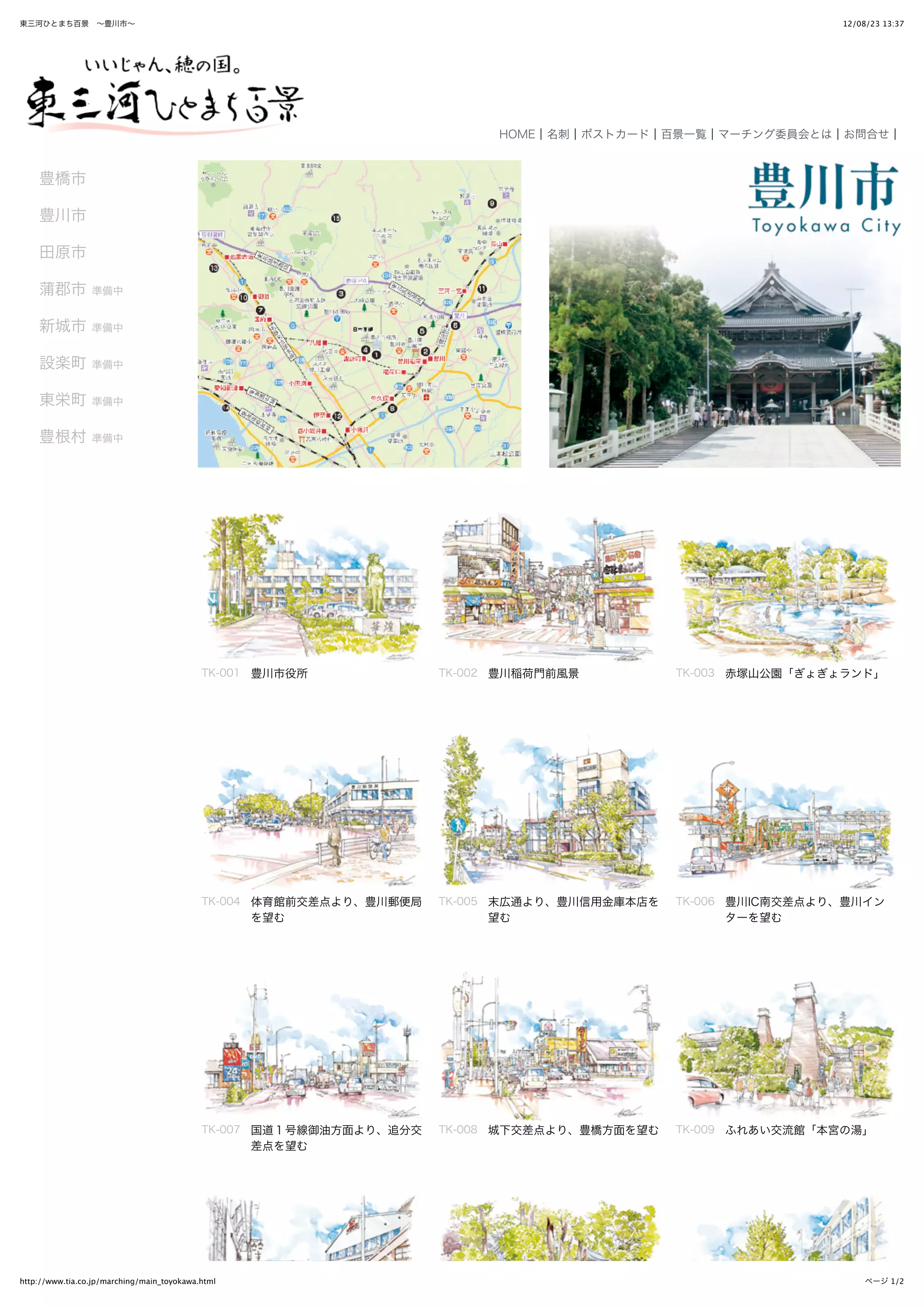 12/08/23 13:37 HOME│名刺│ポストカード│百景一覧│マーチング委員会とは│お問合せ│ 豊橋市 豊川市 田原市 蒲郡市 準備中 新城市 準備中 設楽町 準備中 東栄町 準備中 豊根村 準備中 TK-001 豊川市役所 TK-002 豊川稲荷門前風景 TK-003 赤塚山公園「ぎょぎょランド」 TK-004 体育館前交差点より、豊川郵便局 TK-005 末広通より、豊川信用金庫本店を TK-006 豊川IC南交差点より、豊川イン を望む 望む ターを望む TK-007 国道1号線御油方面より、追分交 TK-008 城下交差点より、豊橋方面を望む TK-009 ふれあい交流館「本宮の湯」 差点を望む http://www.tia.co.jp/marching/main_toyokawa.html ページ 1/2