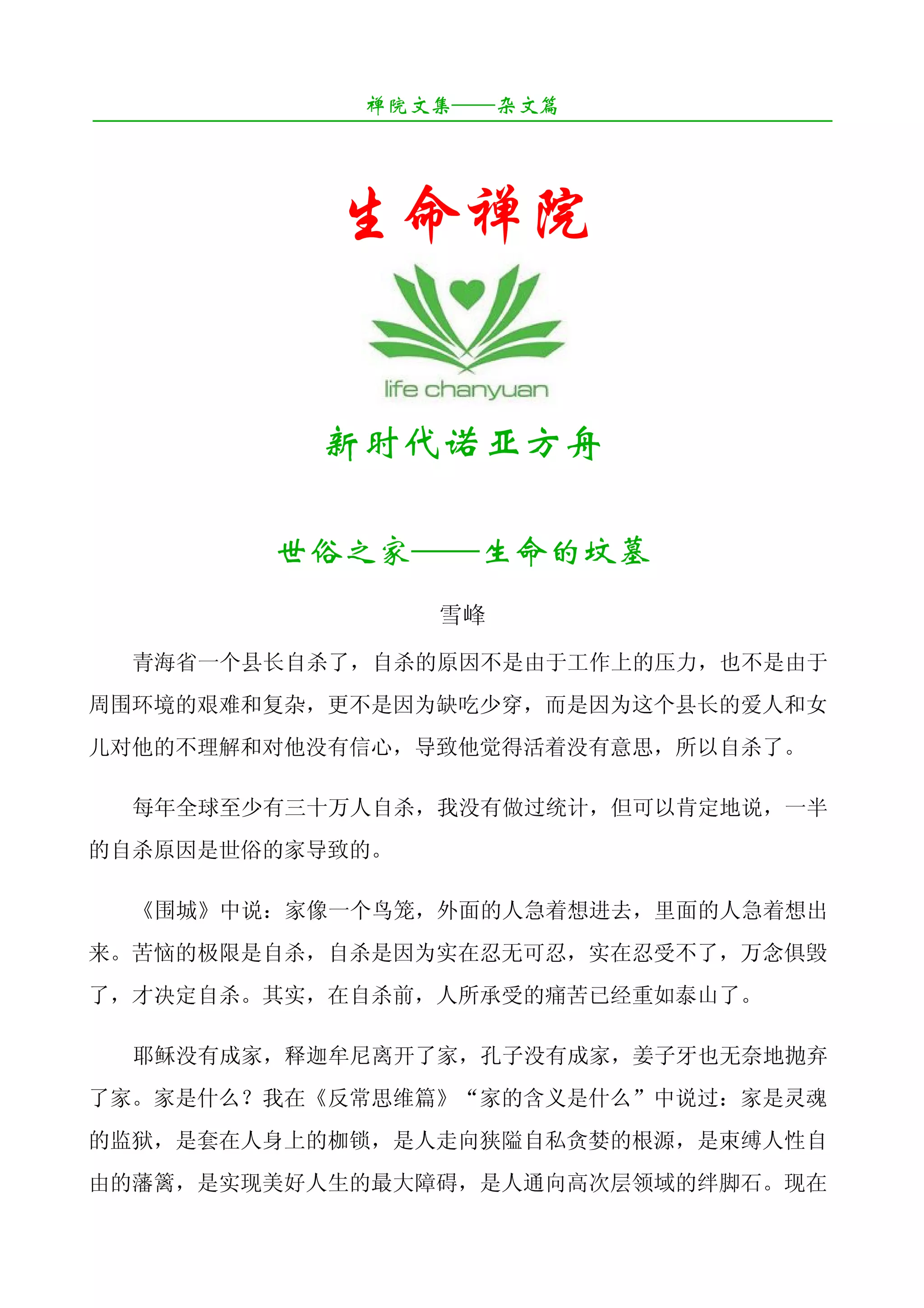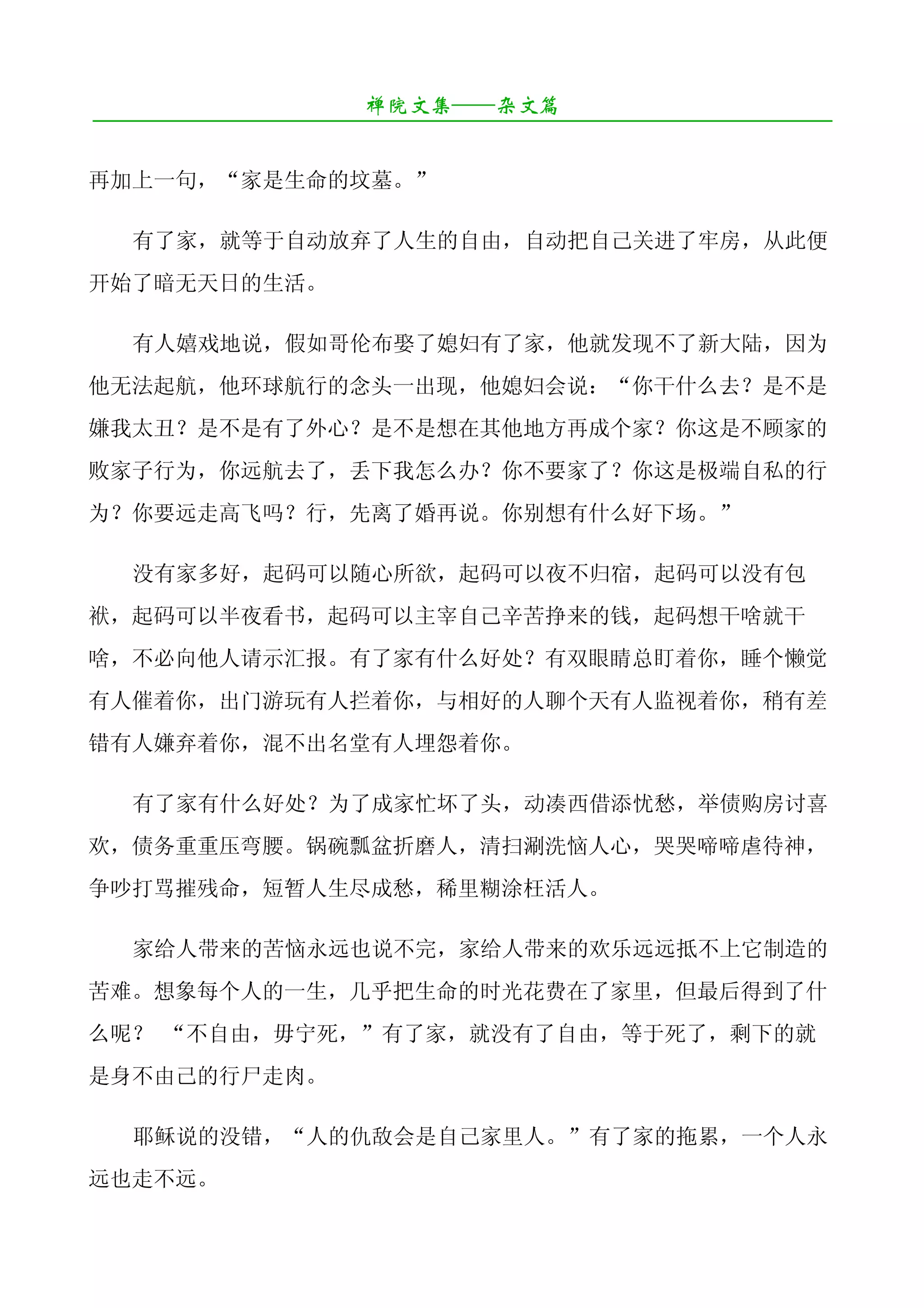 该文档探讨了家庭对个体自由的限制,认为家庭是精神的监狱,导致人们痛苦和压抑。文中引用案例指出,家人之间的误解和压力可能引发悲剧,强调了不结婚能够获得自由和快乐的观点。作者呼吁人们珍视个人自由,避免陷入家庭的束缚。