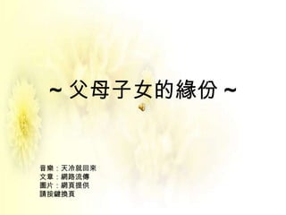 ~ 父母子女的緣份 ~ 音樂:天冷就回來 文章:網路流傳 圖片:網頁提供 請按鍵換頁