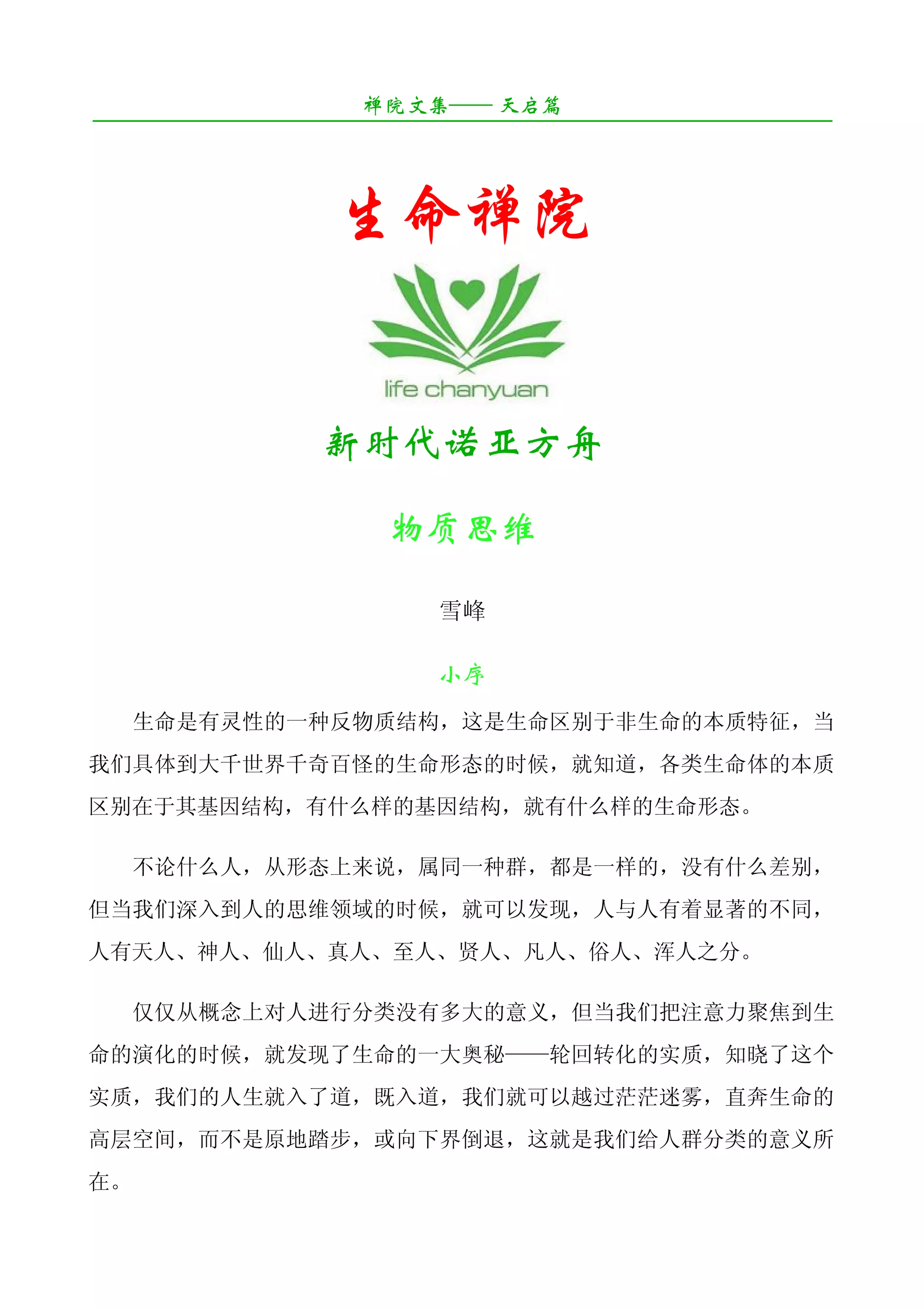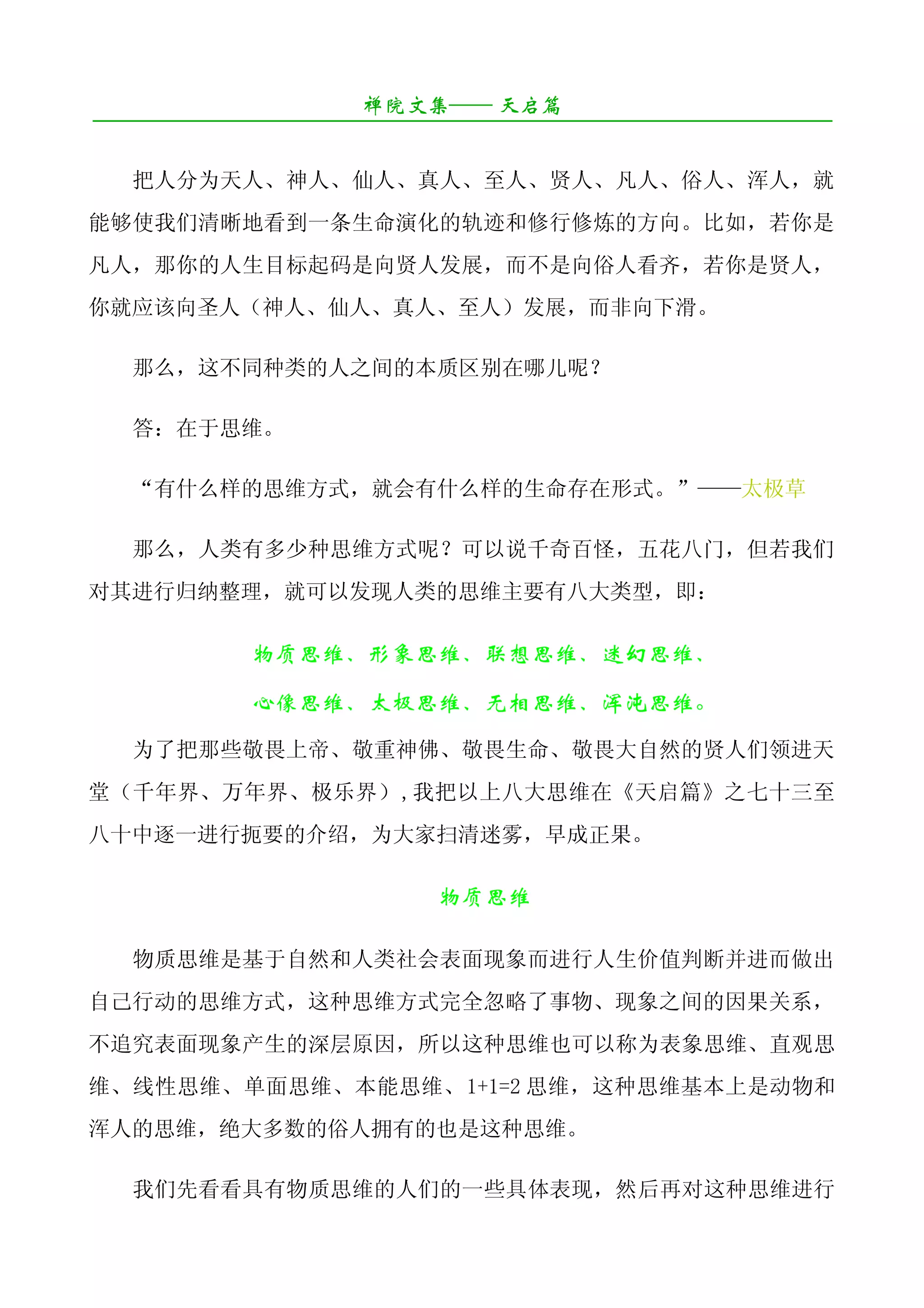 文档探讨了生命与思维方式的关系,指出生命的本质在于基因结构与思维方式的区别。通过将人分为不同种类,强调了不断提升思维境界的重要性,并特别分析了物质思维的表现和对社会的影响,认为教育是改善这一状况的关键。最终,强调物质思维者的存在是人类文明的主要威胁,且教化工作不可忽视。