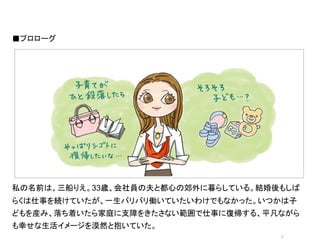オシャレなイラストor写真 私の名前は、三船りえ。33歳、会社員の夫と都心の郊外に暮らしている。結婚後もしば らくは仕事を続けていたが、一生バリバリ働いていたいわけでもなかった。いつかは子 どもを産み、落ち着いたら家庭に支障をきたさない範囲で仕事に復帰する、平凡ながら も幸せな生活イメージを漠然と抱いていた。 2