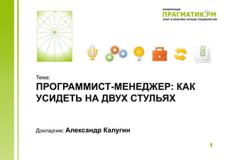 Доклад Александра Калугина посвящен совмещению ролей программиста и менеджера проектов, обсуждающему особенности, преимущества и сложности данной модели работы. Основное внимание уделяется управлению командой, коммуникации с заказчиком, а также необходимости четкого определения ролей и ожиданий. Калугин также предлагает стратегии для эффективного управления временем и задачами в условиях многозадачности.