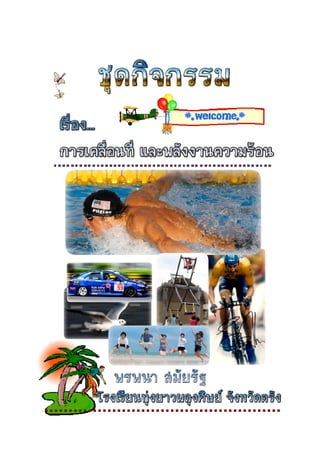 31101) สาระที่ 4 แรงและการเคลื่อนที่ และ สาระที่ 5 พลังงาน เรื่อง การเคลื่อนที่และพลังงานความรอน ผูจัดทําไดศึกษาวิเคราะหหลักสูตร การศึกษาขั้นพื้นฐาน พุทธศักราช 2544 กลุมสาระการเรียนรูวิทยาศาสตร ประกอบดวย 5 หนวยยอยใช เวลาศึกษาทั้งหมด 12 คาบ (คาบละ 50 นาที) ผลการเรียนรูที่คาดหวัง เมื่อจบบทเรียน 1. สืบคนขอมูลและอธิบายปริมาณสเกลาร ปริมาณเวกเตอร 2. ทดลองและอธิบายระยะทาง การกระจัด อัตราเร็วและความเร็ว ในการเคลื่อนที่ของวัตถุ 3. ทดลองและอธิบายอุณหภูมิและการวัดอุณหภูมิ 4. สังเกตและอธิบายการถายโอนความรอน และนําความรูไปใชประโยชน 5. อธิบายการดูดกลืนการคายความรอน โดยการแผรังสี และนําความรูไปใชประโยชน 6. อธิบายสมดุลความรอนและผลของความรอนตอการขยายตัวของสารและนําความรู ไปใชในชีวตประจําวัน ิ วัตถุประสงคในการสรางชุดกิจกรรม 1. เพื่อใชเปนสื่อประกอบการจัดการเรียนรู รายวิชาวิทยาศาสตร (ว 31101 ) เรื่อง การเคลื่อนที่และพลังงานความรอน ซึ่งเปนสื่อที่เหมาะสมตามธรรมชาติวิชา ใหผูเรียนได สื บ เสาะหาความรู จ ากการปฏิ บั ติ กิ จ กรรมการเรี ย นรู ตามวิ ธี ก ารทางวิ ท ยาศาสตร มี ทั ก ษะ กระบวนการทางวิทยาศาสตร และสามารถสรุปเปนองคความรูตลอดจนนําความรู และทักษะ กระบวนการที่ไดไปใชในชีวิตประจําวัน 2. เพื่อใหนักเรียนมีความรูความเขาใจเกี่ยวกับเนื้อหา การนําความรูไปใชในชีวิตประจําวัน มีเจตคติที่ดีตอวิชาวิทยาศาสตร และมีความพึงพอใจในสื่อที่ใชในการเรียนรู