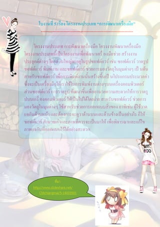 โครงงานประเภท “การพัฒนาเครื่องมือ” ----------------------------------------------------------------- โครงงานประเภท การพัฒนาเครื่องมือ โครงงานพัฒนาเครื่องมือ โครงงานประเภทนี้เปนโครงงานเพื่อพัฒนาเครื่ องมือชวย สรางงาน ประยุกตตางๆ โดยสวนใหญจะอยูในรูปซอฟตแวร เชน ซอฟตแวร วาดรูป ซอฟตแวร พิมพงาน และซอฟตแวร ชวยการมองวัตถุในมุมตางๆ เป นตน สาหรับซอฟตแวร เพื่อการพิมพงานนั้นสรางขึ้นเป นโปรแกรมประมวลคา ซึ่งจะเปนเครื่องมือใหเราใชในการพิมพงานตางๆบนเครื่องคอมพิวเตอร สวนซอฟตแวร การวาดรูป พัฒนาขึ้นเพื่ออานวยความสะดวกใหการวาดรู ปบนเครื่ องคอมพิวเตอร ใหเปนไปไดโดยงาย สาหรับซอฟตแวร ชวยการ มองวัตถุในมุมตางๆ ใชสาหรับชวยการออกแบบสิ่งของ อาทิเชน ผูใชวาด แจกันดานหนา และตองการจะดูวาดานบนและดานขางเปนอยางไร ก็ให ซอฟตแวร คำนวณคาและภาพที่ควรจะเปนมาให เพื่อพิจารณาและแกไข ภาพแจกันที่ออกแบบไวไดอยางสะดวก ที่มา http://www.slideshare.net/ CMchiangmai/5-14003501