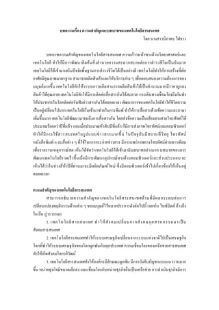 โดย นางสาวนิภาพร ไฝขาว บทบาทความสําคัญของเทคโนโลยีสารสนเทศ ความกาวหนาทางดานวิทยาศาสตรและ เทคโนโลยี ทําใหมีการพัฒนาคิดคนสิ่งอํานวยความสะดวกสบายตอการดํารงชีวิตเปนอันมาก เทคโนโลยีไดเขามาเสริมปจจัยพื้นฐานการดํารงชีวิตไดเปนอยางดี เทคโนโลยีทําใหการสรางที่พัก อาศัยมีคุณภาพมาตรฐาน สามารถผลิตสินคาและใหบริการตาง ๆ เพื่อตอบสนองความตองการของ มนุษยมากขึ้น เทคโนโลยีทําใหระบบการผลิตสามารถผลิตสินคาไดเปนจํานวนมากมีราคาถูกลง สินคาไดคุณภาพ เทคโนโลยีทําใหมีการติดตอสื่อสารกันไดสะดวก การเดินทางเชื่อมโยงถึงกันทํา ใหประชากรในโลกติดตอรับฟงขาวสารกันไดตลอดเวลา พัฒนาการของเทคโนโลยีทําใหชีวิตความ เปนอยูเปลี่ยนไปมาก เทคโนโลยีเริ่มเขามาชวยในการพิมพ ทําใหการสื่อสารดวยขอความและภาษา เพิ่มขึ้นมาก เทคโนโลยีพัฒนามาจนถึงการสื่อสารกัน โดยสงขอความเปนเสียงทางสายโทรศัพทได ประมาณรอยกวาปที่แลว และเมื่อประมาณหาสิบปที่แลว ก็มีการสงภาพโทรทัศนและคอมพิวเตอร ทํ า ให มี ก ารใช ส ารสนเทศในรู ป แบบข า วสารมากขึ้ น ในป จ จุ บั น มี ส ถานที่ วิ ท ยุ โทรทั ศ น หนังสือพิมพ แ ละสื่อตาง ๆ ที่ใชในการกระจายขาวสาร มีการแพรภาพทางโทรทัศนผานดาวเทียม เพื่อรายงานเหตุการณสด เห็นไดชัดวาเทคโนโลยีไดเขามามีบทบาทอยางมาก บทบาทของการ พัฒนาเทคโนโลยีรวดเร็วขึ้นเมื่อมีการพัฒนาอุปกรณทางดานคอมพิวเตอรและสวนประกอบ จะ เห็นไดวาในชวงสี่หาปที่ผานมาจะมีผลิตภัณฑใหม ซึ่งมีคอมพิวเตอรเขาไปเกี่ยวของใหเห็นอยู ตลอดเวลา ความสําคัญของเทคโนโลยีสารสนเทศ สามารถอธิ บ ายความสํ า คั ญ ของเทคโนโลยี ส ารสนเทศด า นที่ มี ผ ลกระทบต อ การ เปลี่ยนแปลงพฤติกรรมดานตาง ๆ ของมนุษยไวหลายประการดังตอไปนี้ (จอหน ไนซบิตต อางถึง ใน ยืน ภูวรวรรณ) 1. เทคโนโลยี ส ารสนเทศ ทํ า ให สั ง คมเปลี่ ย นจากสั ง คมอุ ต สาหกรรมมาเป น สังคมสารสนเทศ 2. เทคโนโลยีสารสนเทศทําใหระบบเศรษฐกิจเปลี่ยนจากระบบแหงชาติไปเปนเศรษฐกิจ โลกที่ทําใหระบบเศรษฐกิจของโลกผูกพันกับทุกประเทศ ความเชื่อมโยงของเครือขายสารสนเทศ ทําใหเกิดสังคมโลกาภิวัฒน 3. เทคโนโลยีสารสนเทศทําใหองคกรมีลักษณะผูกพัน มีการบังคับบัญชาแบบแนวราบมาก ขึ้น หนวยธุรกิจมีขนาดเล็กลง และเชื่อมโยงกับหนวยธุรกิจอื่นเปนเครือขาย การดําเนินธุรกิจมีการ