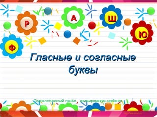 Документ предлагает игру для проверки знаний гласных и согласных букв русского алфавита, где игроки могут получать обратную связь о правильности ответов. С помощью различных цветов карточек обозначаются звуки букв: гласные, твердые и мягкие согласные, а также буквы без звука. Игра может проводиться индивидуально или в компании, а также включает ссылки на ресурсы для более глубокой информации.