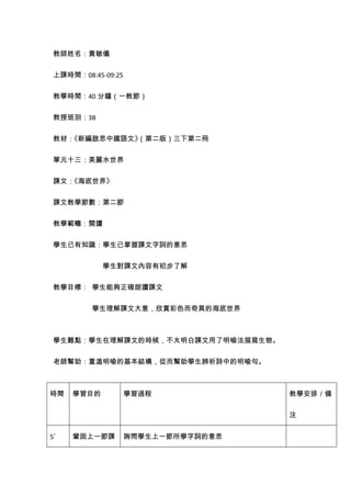 本课程由黄敏仪老师教授,围绕《海底世界》这篇课文展开,旨在帮助3B班的学生提高朗读能力和理解能力。教学重点是通过明喻法分析课文内容,并讨论海底的生物特征。课程结束时,学生将分组讨论,以巩固对诗歌的理解,并完成相关工作纸。