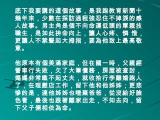 這個故事描繪了一位單親家庭的學生,他克服了貧困和父母離婚的逆境,以非凡的努力和毅力追求學業,最終考上台灣大學研究所。儘管身處困境,他依然沒有向命運低頭,並在大學四年中打工賺取學費,表現優異,讓父親感到愧疚與驕傲。這是一個反映台灣社會中勇敢與堅持的感人故事。