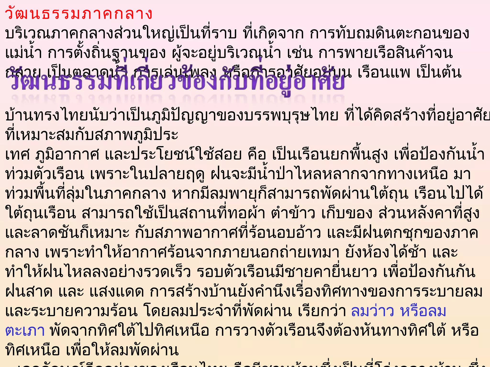 บ้า นเรือ นไทยหรือ เรือ นไทย เรือนไทยภาคกลางจะสร้างด้วยไม้ แบ่ง
