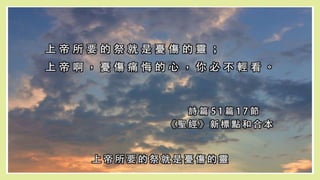 如果你還在犯罪的痛苦中,這一篇經文就是為你所寫的,神能 將你的痛苦轉變成為祝福,你相信嗎? 這一切又是如何做到的? • 今天的經文也許是最讓人痛心的一篇,但是也是最蒙祝福的一篇,因為 神實在是看到你的痛苦了,他也願意與你一起背負這樣的重擔,帶領你 走過那最黑暗的時刻! 你願意嗎?