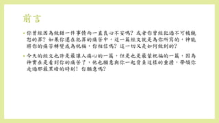 前言 • 你曾經因為做錯一件事情而一直良心不安嗎? 或者你曾經犯過不可被饒 恕的罪?
