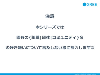 Inc. All Rights Reserved. 注意 本シリーズでは 固有の{組織|団体|コミュニティ}名 の好き嫌いについて言及しない様に努力します