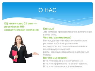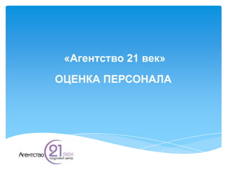 Агентство 21 Век — российская HR-консалтинговая компания, предлагающая услуги оценки персонала и управления человеческими ресурсами для бизнеса в России, Белоруссии и Украине. Основные услуги включают использование различных инструментов оценки, таких как ассессмент-центры, тестирования и индивидуальные интервью, целью которых является улучшение работы сотрудников и развитие их компетенций. Компания работает с клиентами из различных отраслей, включая торговлю, финансы, телекоммуникации и медицину.