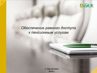 Документ описывает развитие пенсионных услуг в Нур-Султане, включая создание мобильных офисов и электронных сервисов для удобства клиентов. В 2018 году было проведено более 4.5 миллиона операций, запланировано расширение функционала и внедрение новых технологий в 2019 году. Акцент сделан на обеспечение равного доступа к услугам для социально уязвимых групп населения.