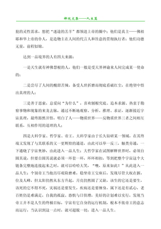 该文档探讨了人生的不同品位,特别强调了超凡脱俗的一品人生,认为这类人具备深刻的智慧和理解力,能够超越社会地位和财富。而二品人生和三品人生则描述了信仰坚守者和与世无争的智慧者,他们在信仰或内心追求中努力追求真理和自我解放。通过对这四个品位的分析,文章强调了内在灵性的成长与人类生活的深层联系。