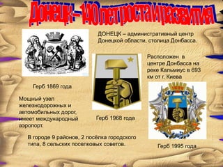 Донецк, расположенный на реке Кальмиус и являющийся административным центром Донецкой области, был основан в 1869 году с созданием металлургического завода. Город активно развивался благодаря добыче угля и строительству железных дорог, что привлекло множество рабочих и коммерсантов. В результате к началу 20 века Донецк стал крупным промышленным и торговым центром юга России.