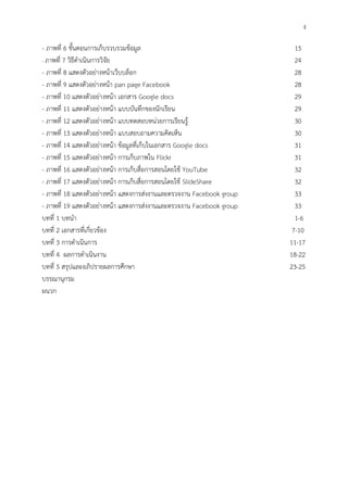 ขั้นตอนการเก็บรวบรวมข้อมูล 15 - ภาพที่ 7 วิธีดาเนินการวิจัย 24 - ภาพที่ 8 แสดงตัวอย่างหน้าเว็บบล็อก 28 - ภาพที่ 9 แสดงตัวอย่างหน้า pan page Facebook 28 - ภาพที่ 10 แสดงตัวอย่างหน้า เอกสาร Google docs 29 - ภาพที่ 11 แสดงตัวอย่างหน้า แบบบันทึกของนักเรียน 29 - ภาพที่ 12 แสดงตัวอย่างหน้า แบบทดสอบหน่วยการเรียนรู้ 30 - ภาพที่ 13 แสดงตัวอย่างหน้า แบบสอบถามความคิดเห็น 30 - ภาพที่ 14 แสดงตัวอย่างหน้า ข้อมูลที่เก็บในเอกสาร Google docs 31 - ภาพที่ 15 แสดงตัวอย่างหน้า การเก็บภาพใน Flickr 31 - ภาพที่ 16 แสดงตัวอย่างหน้า การเก็บสื่อการสอนโดยใช้ YouTube 32 - ภาพที่ 17 แสดงตัวอย่างหน้า การเก็บสื่อการสอนโดยใช้ SlideShare 32 - ภาพที่ 18 แสดงตัวอย่างหน้า แสดงการส่งงานและตรวจงาน Facebook group 33 - ภาพที่ 19 แสดงตัวอย่างหน้า แสดงการส่งงานและตรวจงาน Facebook group 33 บทที่ 1 บทนา 1-6 บทที่ 2 เอกสารที่เกี่ยวข้อง 7-10 บทที่ 3 การดาเนินการ 11-17 บทที่ 4 ผลการดาเนินงาน 18-22 บทที่ 5 สรุปและอภิปรายผลการศึกษา 23-25 บรรณานุกรม ผนวก