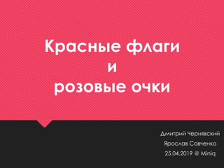 Доклад Дмитрия Чернявского и Ярослава Савченко обсуждает понятие 'красный флаг' в контексте IT, обозначая серьёзные проблемы, такие как критическое ухудшение процессов и отсутствие документации. Приведены различные типы красных флагов и их уровни, а также личные наблюдения о творческой профессии и современных технологиях. Доклад подчеркивает важность команды и коммуникации в рабочих процессах.