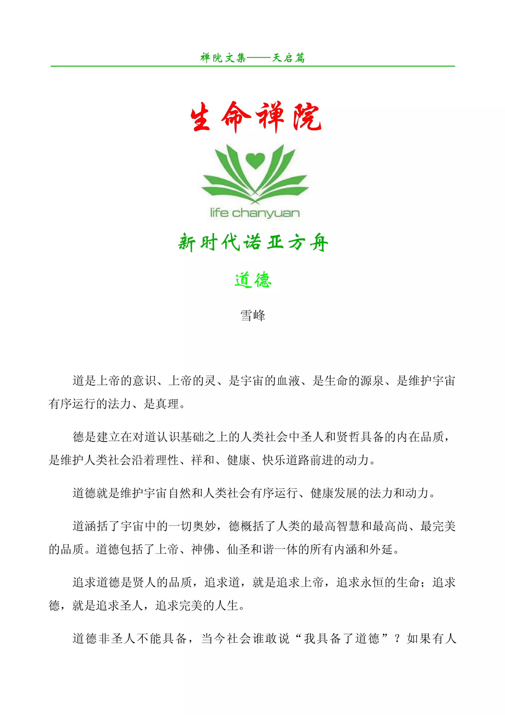 《禅院文集——天启篇》探讨了道与德的关系,强调道是宇宙的真理,而德是人类社会应具备的内在品质。文章指出,追求道德的人能够超越普通人,将道德理解与追求看作成为贤人的标志。最终,作者认为只有《生命禅院》的院士们能具备真正的道德,与其他宗教和政党相比较为开放和包容。