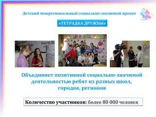 Проект «тетрадка дружбы» объединяет более 80 000 детей из разных регионов России для взаимодействия в рамках социокультурного пространства, направленного на развитие социальных инициатив и интеграцию школьных коллективов. Проект предлагает участие в творческих, спортивных и добровольческих мероприятиях, решая проблемы детского одиночества и формируя альянсы между учащимися, педагогами и родителями. В перспективе планируется создание интернет-блога и центров развития добровольчества, что подчеркивает долгосрочность и значимость проекта.