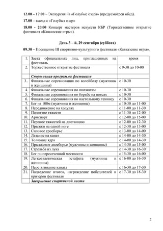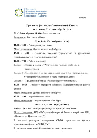 Документ представляет программу фестиваля «Гостеприимный Кавказ», который пройдет в Нальчике с 27 по 29 сентября 2012 года. В программе предусмотрены регистрация участников, пленарные заседания, работа в секциях, выставка продукции, экскурсии, и спортивные соревнования. Завершится фестиваль торжественным ужином и гала-концертом.