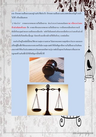 จะกระทําอะไร อยางไร ดวยเหตุผลอะไร โดยธรรมชาติมนุษยมี ิ แนวโนมทีจะใฝหาความสุข ความสบาย หลีกหนีความทุกขยาก ความลําบาก และโดยธรรมชาติมนุษย ่ อาจจะปฏิบัติตอผูอื่นอยางเลวรายหรืออยางเอารัดเอาเปรียบ หากวาตนเองจะไดรับประโยชนหรือความสุข ความสบายเปนเครื่องตอบแทนถาทุกคนปฏิบัติเชนนั้นสังคมก็จะยุงเหยิงวุนวายที่สุดแลวก็คงไมมใครทีจะ ี ่ อยูไดอยางสุขสงบ ดังนันจึงจําเปนทีจะตองมีกฏเกณฑรวมกัน การที่จะใหผูอื่นเคารพสิทธิของตนเองและ ้ ่ ไมเบียดเบียนตนเอง ตนก็ตองเคารพสิทธิของผูอื่นและไมเบียดเบียนผูอื่น ตนเองอยากใหผูอื่นปฏิบัติตอ ตนเองอยางไร ก็ตองปฏิบัติอยางนั้นตอผูอื่น ความเปนธรรมเปนแมแบบของแนวทางตางๆ เปนแนวทางในเกณฑการตัดสิน ซึ่งมีกฏหมายเปน เครื่องมือในการทําหนาที่ ความเปนธรรมนันเปนเรื่องที่ละเอียดเพราะการทีคนเราจะกําหนดวาอะไรคือ ้ ่ ความดี แลวความดีกับความชั่วตางกันตรงไหนเปนเรื่องที่ตองวิเคราะหกันอยางละเอียด ถาเราไมสามารถ หาคํานิยามของคุณธรรมเหลานี้ได เราก็จะไมสามารถมีความรูเกี่ยวกับคุณธรรมได และการตัดสินวาการ กระทําหนึ่งมีความยุติธรรม หรือกลาหาญ ฯลฯ หรือไม ยอมปราศจากหลักเกณฑทนาเชื่อถือ ี่ ความเปนธรรมเปนตัวกําหนดทิศทางของสังคม ซึ่งความเปนธรรมของแตละสังคมไมเหมือนกัน ยกตัวอยาง เชน หากสังคมหนึ่งทุกคนเห็นพองตองกันวา การขโมยของเปนเรื่องที่ถูกตอง ถือวายุติธรรม ซึ่งในความ เปนจริงแลวความเปนธรรมที่เปนที่นิยมมากที่สุดเปนความยุติธรรมที่ตองอยูคูกับ คุณธรรมและจริยธรรม ที่ เปนเครื่องชวยในการกําหนดกฎเกณฑวาสิ่งไหนเปนสิ่งทีดี ถูกตอง และเหมาะสม แลวความเปนธรรมแบบ ่ ไหนที่คนสวนมากจะยอมรับ ตัวอยางเหตุการณไมเปนธรรมในสังคม 1.เรื่องใหญที่สุดถาเราทําแตเรื่องปลีกยอยเปนชิ้นๆ สวนๆ โดยไมเห็นเรื่องใหญที่สุด ก็จะไมสําเร็จหรือ ขัดแยงกันมากขึ้น สังคมที่ขาดความเปนธรรมจะมีความขัดแยงและความรุนแรง ผูคนจะไมรกกัน และไม ั รักชาติ แลวก็จะวิกฤติมากขึนเรื่อยๆ จนลมสลาย ความเปนธรรมเปนเรื่องใหญที่สุดสําหรับมนุษยหรือ ้ แมแตสัตว ถาสุนัขตัวไหนมันไดกินมากกวาตัวอื่นก็จะกัดกันยกใหญ ถามันไดกนทั่วถวนกันทุกตัวก็จะเกิด ิ ความสงบ ถามีความเปนธรรมแลวมนุษยยอมไดทั้งสิ้นไมวาจะยากลําบากอยางไร หรือแมกระทั่งยอม