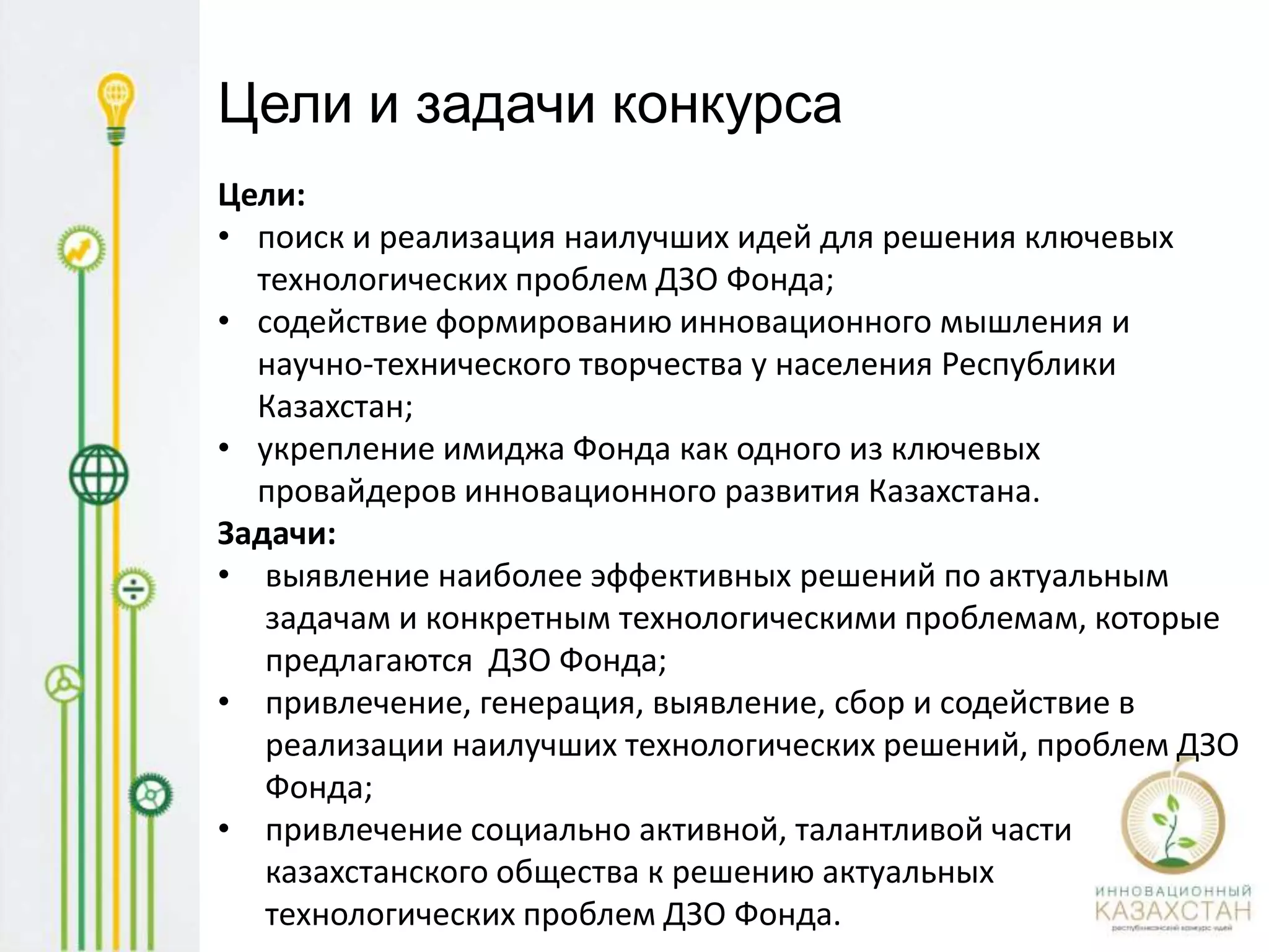 В документе описаны цели и задачи конкурса, направленного на выявление и реализацию технологий для решения актуальных проблем, а также развитие инновационного мышления в Казахстане. Конкурс включает различные номинации по отраслям, а также специальные призы для компаний и экспертов. Критерии оценки заявок включают реализуемость, рентабельность и другие показатели, что обеспечивает тщательный отбор идей.