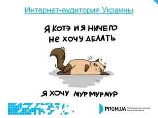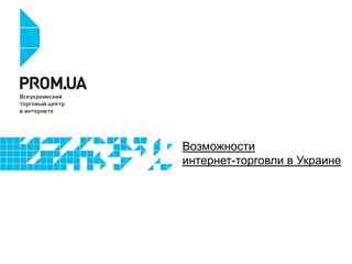 Документ анализирует возможности интернет-торговли в Украине, включая поведение интернет-аудитории и различные способы продаж онлайн. Рассматриваются преимущества и недостатки создания собственных интернет-магазинов и использования торговых площадок, а также значение правильного позиционирования товаров. Упоминается опыт компании "Смарт Квин" в интегрированном маркетинге и преимущества использования сайта на платформе prom.ua.