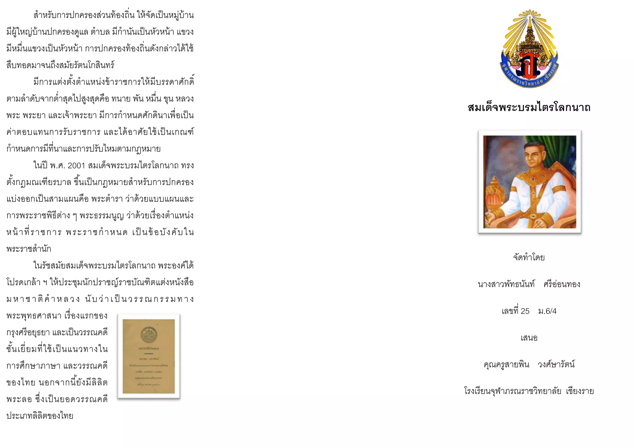 จดเป็ นหมู่บ้ำน ั มีผ้ ใหญ่บ้ำนปกครองดูแล ตำบล มีกำนันเป็ นหัวหน้ ำ แขวง ู มีหมื่นแขวงเป็ นหัวหน้ ำ กำรปกครองท้ องถิ่นดังกล่ำวได้ ใช้ สืบทอดมำจนถึงสมัยรัตนโกสินทร์ มี กำรแต่งตังตำแหน่งข้ ำรำชกำรให้ มีบรรดำศักดิ์ ้ ตำมลำดับจำกต่ำสุดไปสูงสุดคือ ทนำย พัน หมื่น ขุน หลวง พระ พระยำ และเจ้ ำพระยำ มีกำรกำหนดศักดินำเพื่อเป็ น สมเด็จพระบรมไตรโลกนาถ ค่ำ ตอบแทนกำรรั บ รำชกำร และได้ อ ำศัย ใช้ เ ป็ นเกณฑ์ กำหนดกำรมีที่นำและกำรปรับไหมตำมกฎหมำย ในปี พ.ศ. 2001 สมเด็จพระบรมไตรโลกนำถ ทรง ตังกฎมณเฑียรบำล ขึ ้นเป็ นกฎหมำยสำหรับกำรปกครอง ้ แบ่งออกเป็ นสำมแผนคือ พระตำรำ ว่ำด้ วยแบบแผนและ กำรพระรำชพิธีต่ำง ๆ พระธรรมนูญ ว่ำด้ วยเรื่ องตำแหน่ง หน้ ำที่ รำชกำร พ ระรำชก ำหนด เป็ นข้ อบั ง คั บ ใน พระรำชสำนัก จัดทำโดย ในรัชสมัยสมเด็จพระบรมไตรโลกนำถ พระองค์ได้ โปรดเกล้ ำ ฯ ให้ ประชุมนักปรำชญ์ รำชบัณฑิตแต่งหนังสือ นำงสำวพัทธนันท์ ศรี ออนทอง ่ ม ห ำ ช ำ ติ ค ำ ห ล ว ง นั บ ว่ ำ เ ป็ น ว ร ร ณ ก ร ร ม ท ำ ง พระพุทธศำสนำ เรื่ องแรกของ เลขที่ 25 ม.6/4 กรุงศรี อยุธยำ และเป็ นวรรณคดี เสนอ ชัน เยี่ ย มที่ ใ ช้ เป็ นแนวทำงใน ้ กำรศึกษำภำษำ และวรรณคดี คุณครูสำยพิน วงศ์ษำรัตน์ ของไทย นอกจำกนี ยัง มี ลิ ลิ ต ้ โรงเรี ยนจุฬำภรณรำชวิทยำลัย เชียงรำย พระลอ ซึ่ ง เป็ นยอดวรรณคดี ประเภทลิลิตของไทย
