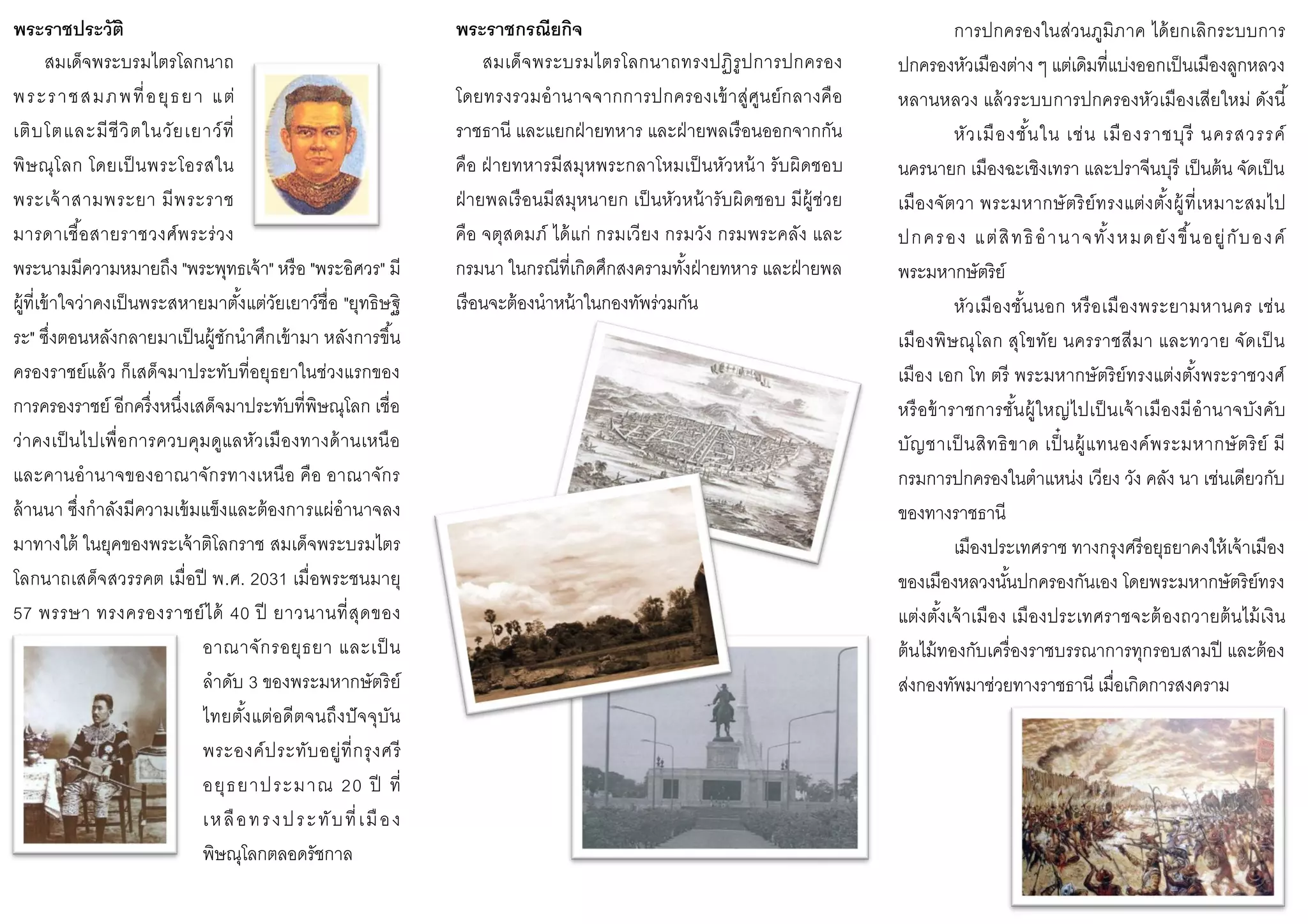 พระราชกรณียกิจ กำรปกครองในส่วนภูมิภ ำค ได้ ยกเลิกระบบกำร สมเด็จพระบรมไตรโลกนำถ สมเด็จ พระบรมไตรโลกนำถทรงปฏิ รูป กำรปกครอง ปกครองหัวเมืองต่ำง ๆ แต่เดิมที่แบ่งออกเป็ นเมืองลูกหลวง พระรำชสมภ พ ที่ อ ยุ ธ ยำ แต่ โดยทรงรวมอำนำจจำกกำรปกครองเข้ ำสู่ศูน ย์ ก ลำงคื อ หลำนหลวง แล้ วระบบกำรปกครองหัวเมืองเสียใหม่ ดังนี ้ เติ บ โตและมี ชี วิ ต ในวั ย เยำว์ ที่ รำชธำนี และแยกฝ่ ำยทหำร และฝ่ ำยพลเรื อนออกจำกกัน หั ว เมื อ งชั น ใน เช่ น เมื อ งรำชบุ รี นครสวรรค์ ้ พิ ษ ณุโ ลก โดยเป็ นพระโอรสใน คือ ฝ่ ำยทหำรมีสมุหพระกลำโหมเป็ นหัวหน้ ำ รับผิดชอบ นครนำยก เมืองฉะเชิงเทรำ และปรำจีนบุรี เป็ นต้ น จัดเป็ น พระเจ้ ำสำมพระยำ มี พ ระรำช ฝ่ ำยพลเรื อนมีสมุหนำยก เป็ นหัวหน้ ำรับผิดชอบ มีผ้ ูช่วย เมื อ งจัต วำ พระมหำกษั ตริ ย์ทรงแต่ง ตัง ผู้ ที่ เหมำะสมไป ้ มำรดำเชื อ สำยรำชวงศ์พ ระร่ ว ง ้ คือ จตุสดมภ์ ได้ แก่ กรมเวี ยง กรมวัง กรมพระคลัง และ ปกครอง แต่ สิ ท ธิ อ ำนำจทั ง หมดยั ง ขึ น อยู่ กั บ อง ค์ ้ ้ พระนำมมีควำมหมำยถึง "พระพุทธเจ้ ำ" หรื อ "พระอิศวร" มี กรมนำ ในกรณีที่เกิดศึกสงครำมทังฝ่ ำยทหำร และฝ่ ำยพล ้ พระมหำกษัตริย์ ผู้ที่เข้ ำใจว่ำคงเป็ นพระสหำยมำตังแต่วยเยำว์ชื่อ "ยุทธิษฐิ ้ ั เรื อนจะต้ องนำหน้ ำในกองทัพร่วมกัน หัว เมื อ งชัน นอก หรื อ เมื อ งพระยำมหำนคร เช่น ้ ระ" ซึ่งตอนหลังกลำยมำเป็ นผู้ชกนำศึกเข้ ำมำ หลังกำรขึ ้น ั เมื องพิษณุโลก สุโ ขทัย นครรำชสี ม ำ และทวำย จัดเป็ น ครองรำชย์แล้ ว ก็เสด็จมำประทับที่อยุธยำในช่วงแรกของ เมือง เอก โท ตรี พระมหำกษัตริ ย์ทรงแต่งตังพระรำชวงศ์้ กำรครองรำชย์ อีกครึ่งหนึ่งเสด็จมำประทับที่พิษณุโลก เชื่อ หรื อข้ ำรำชกำรชัน ผู้ใหญ่ ไ ปเป็ นเจ้ ำเมื องมี อำนำจบัง คับ ้ ว่ำคงเป็ นไปเพื่ อ กำรควบคุม ดูแลหัวเมื องทำงด้ ำนเหนื อ บัญ ชำเป็ นสิ ท ธิ ข ำด เป็๋ นผู้แ ทนองค์ พ ระมหำกษั ต ริ ย์ มี และคำนอำนำจของอำณำจักรทำงเหนื อ คือ อำณำจักร กรมกำรปกครองในตำแหน่ง เวียง วัง คลัง นำ เช่นเดียวกับ ล้ ำนนำ ซึ่งกำลังมีควำมเข้ มแข็งและต้ องกำรแผ่อำนำจลง ของทำงรำชธำนี มำทำงใต้ ในยุคของพระเจ้ ำติโลกรำช สมเด็จพระบรมไตร เมืองประเทศรำช ทำงกรุงศรี อยุธยำคงให้ เจ้ ำเมือง โลกนำถเสด็จสวรรคต เมื่อปี พ.ศ. 2031 เมื่อพระชนมำยุ ของเมืองหลวงนันปกครองกันเอง โดยพระมหำกษัตริ ย์ทรง ้ 57 พรรษำ ทรงครองรำชย์ ไ ด้ 40 ปี ยำวนำนที่ สุด ของ แต่งตังเจ้ ำเมือง เมืองประเทศรำชจะต้ องถวำยต้ นไม้ เงิ น ้ อำณำจัก รอยุ ธ ยำ และเป็ น ต้ นไม้ ทองกับเครื่ องรำชบรรณำกำรทุกรอบสำมปี และต้ อง ลำดับ 3 ของพระมหำกษัตริ ย์ ส่งกองท