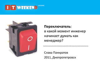 Документ описывает переход инженера к мышлению менеджера, подчеркивая опыт автора в IT и тренингах. Он выделяет ключевые аспекты различий между инженерами и менеджерами, а также процесс внутреннего переключения, который может занять от 6 месяцев до 2 лет. Также упоминаются успехи в организации семинаров и клубов, связанных с карьерным развитием в IT.