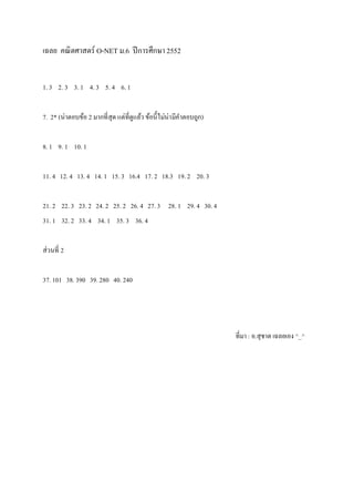 O-NET ม.6 ปี การศึกษา 2552 1. 3 2. 3 3. 1 4. 3 5. 4 6. 1 7. 2* (น่าตอบข้อ 2 มากที่ สุด แต่ที่ดูแล้ว ข้อนี้ไม่น่า มีคาตอบถูก) 8. 1 9. 1 10. 1 11. 4 12. 4 13. 4 14. 1 15. 3 16.4 17. 2 18.3 19. 2 20. 3 21. 2 22. 3 23. 2 24. 2 25. 2 26. 4 27. 3 28. 1 29. 4 30. 4 31. 1 32. 2 33. 4 34. 1 35. 3 36. 4 ส่วนที่ 2 37. 101 38. 390 39. 280 40. 240 ที่มา : อ.สุชาต เฉลยเอง ^_^