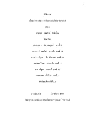 รายงาน เรื่ อง การนาเสนองานด้วยเทคโนโลยีสารสนเทศ เสนอ อาจารย์ ทรงศักดิ์ โพธิ์เอี่ยม จัดทาโดย นาย ยงยุทธ นิลทกาญจน์ เลขที่ 10 นางสาว จินดารัตน์ สุ ขสมัย เลขที่ 13 นางสาว ปฐมพร จิรวุฒิวรนาถ เลขที่ 16 นางสาว ริ นพร เสดวงชัย เลขที่ 18 นาย ณัฐพล ทองแท้ เลขที่ 31 นาย ทศพล ตั้งวิริยะ เลขที่ 37 ชั้นมัธยมศึกษาปี ที่ 5/3 ภาคเรี ยนที่ 1 ปี การศึกษา 2555 โรงเรี ยนเฉลิมพระเกียรติสมเด็จพระศรี นคริ นทร์ กาญจนบุรี