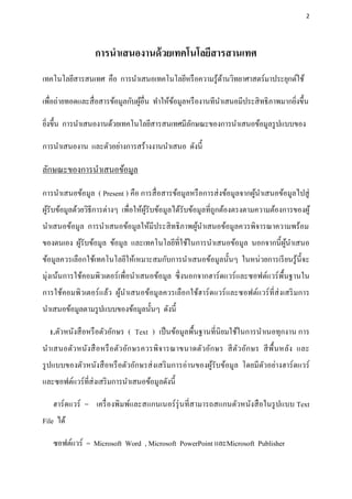 การนาเสนอข้อมูลเป็ นกระบวนการในการทางานเพื่อให้ผูอ่ื นรู ้ และเข้าใจในสิ่ งที่ ผู ้ ้ นาเสนอข้อมูลต้องการให้ผรับข้อมูลรู ้ การนาเสนงานเป็ นส่ วนหนึ่งของการนาเสนอข้อมูล ซึ่ ง ู้ นิยมนาเสนอในรู ปแบบที่สามารถจับต้องหรื อใช้เป็ นหลักฐานอ้างอิงนกระบวนการทางานนั้นๆ ได้ การนาเนองานสามารถปฏิบติได้หลายรู ปแบบ เช่ น เอกสารสิ่ งพิมพ์มลติมีเดีย และเว็บไซต์ ั ั เอกสารสิ่ งพิมพ์ การนาเสนองานที่มีผนิยมใช้มากที่สุด คือ เอกสารสิ่ งพิมพ์ เนื่องจากทางานง่าย สัมผัส ู้ ได้และใช้เป็ นหลักฐานในการนาเสนอข้อมูลได้ ปั จจุบนมีการนาเทคโนโลยีมาใช้ส่งเสริ มการ ั ทางานด้านเอกสารสิ่ งพิมพ์ท้ งในรู ปแบบของเอกสารสิ่ งพิมพ์บนสื่ อต่างๆ จนถึงเอกสารอิเล็ก ั ทอร์อนิกส์ คอมพิวเตอร์ที่ใช้สาหรับสร้างเอกสารสิ่ งพิมพ์ไม่ตองมีประสิ ทธิ ภาพสู งเท่ากับการ ้ นาเสนอด้วยมัลติมิเดียและเว็บไซต์ โดยใช้ฮาร์ดแวร์พ้ืนฐานของคอมพิวเตอร์และเครื่ องพิมพ์ ส่ วนซอฟต์แวร์ ที่ใช้ได้แก่โปรแกรมด้านการประมวลผลคาหรื อโปรแกรมด้านการพิมพ์ เช่ น Microsoft Word , Microsoft Publisher , Adobe PageMaker การนาเสนองานด้วยเอกสาร สิ่ งพิมพ์เป็ นรู ปแบบการนาเสนองานที่มีผเู ้ ลือกใช้มากที่สุด เนื่องจากมีขอดีดงนี้ ้ ั -นาเสนอข้อมูลได้ท้ งรู ปแบบตัวอักษรหรื อตัวหนังสื อ รู ปภาพ ภาพนิ่ง แผนภูมิ แผนผัง ั และกราฟ -สร้างได้ง่าย ต้นทุนต่า และใช้เวลาในการสร้างน้อย -สามารถนาเสนอได้ทุกที่ทุกเวลา -ไม่ตองใช้เทคโนโลยีอื่นๆ ช่วยในการนาเสนอ ้ -เป็ นพื้นฐานของการสร้างงานนาเสนอในรู ปแบบอื่น ั -ประยุกต์ใช้กบการนาเสนอในรู ปแบบอื่นๆ ได้หลากหลาย