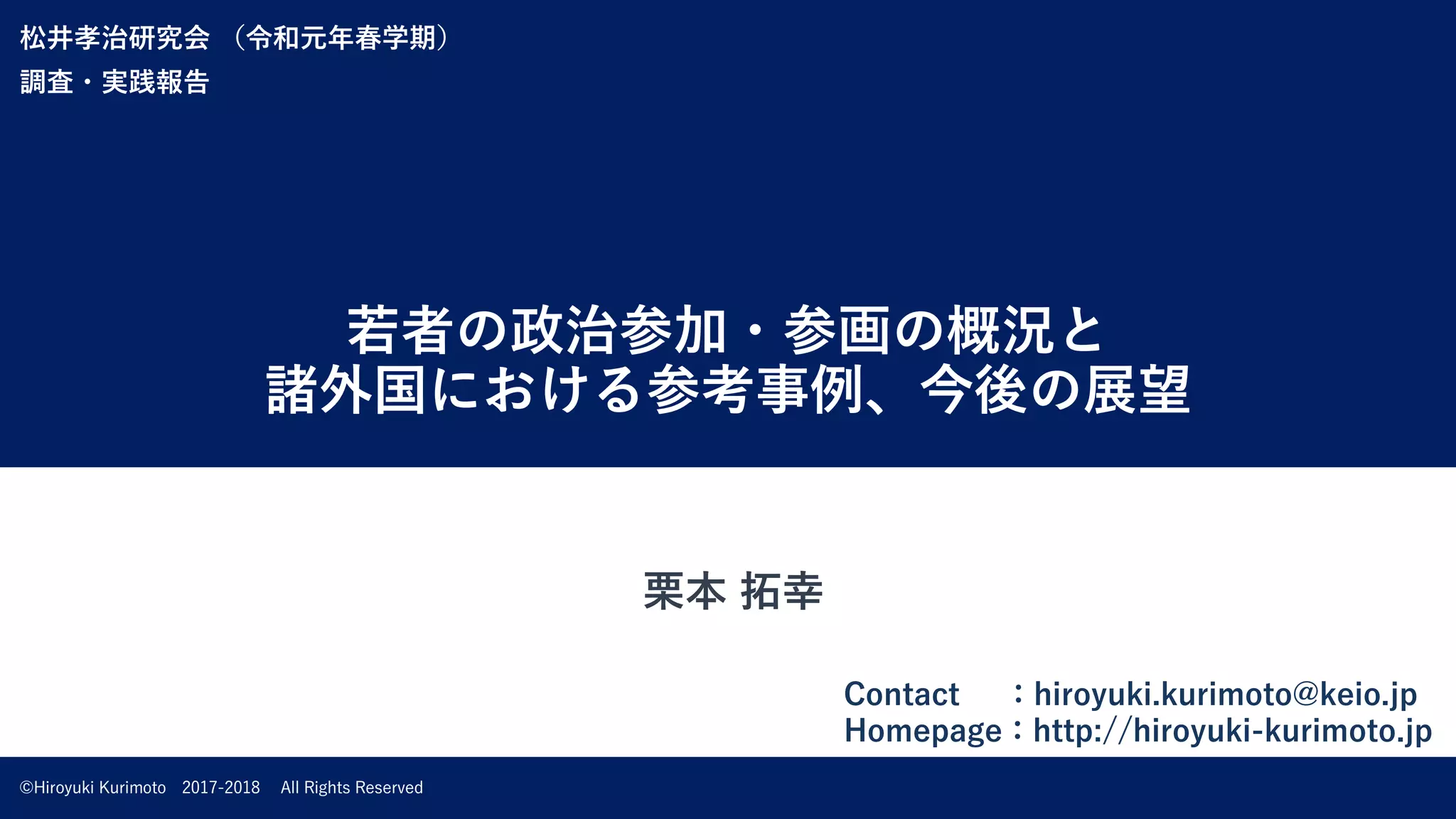 若者の政治参加・参画の概況と 諸外国における参考事例、今後の展望 松井孝治研究会 (令和元年春学期) 調査・実践報告 ©Hiroyuki Kurimoto