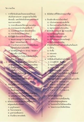 ๆ 1) แม้จะอ้างว่าเป็ นการใช้สทธิตาม ิ รัฐธรรมนูญ แต่พฤติการณ์กชดว่าเป็ นการ ็ ั เตะถ่วง 2) การมุ่งเอาชนะกันโดยปราศจากความ รับผิดชอบก่อให้เกิดผลเสียอันประมาณมิได้ 3) แนวคิดเรื่อง “ธรรมรัฐ” กาลังได้รบการขาน ั รับจากสังคม 4) ถ้ามิใช่เกมการเมือง ไฉนจึงตัดสินใจอย่าง ฉุกละหุกลุกลีลุกลน ้ 20. ข้อใดใช้ภาษาได้เหมาะสมสาหรับการเขียน รายงานทางวิชาการ 1) กระบองเพชรเป็ นพันธุไม้ทแปลกประหลาด ์ ่ี พิสดารทีสดอย่างหนึ่ง และอยู่คโลกมาแล้ว ุ่ ู่ ไม่รกลานปี ู้ ่ี ้ 2) กระบองเพชรบางพันธุสดสวยงดงามในเรื่อง ์ุ ของลาต้น กิงก้านสาขาแถมยังมีดอกทีหอม ่ ่ ลึกซึง ้ 3) ข้อดีของการเลียงกระบองเพชรคือยาฆ่าแมลง ้ แทบไม่ตองใช้ ปุ๋ยก็ใช้น้อย และใส่ห่างกว่า ้ พืชชนิดอื่น ๆ 4) คนส่วนใหญ่มกเชื่อว่ากระบองเพชรเป็ นพืชทีพบ ั ่ ได้เฉพาะในทะเลทรายเท่านัน แท้ทจริงสามารถ ้ ่ี พบแทบทุกสภาพภูมอากาศ ิ