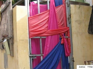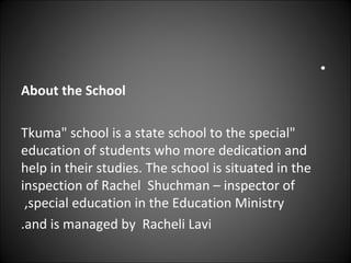 The document summarizes a photography project conducted by students at Tkuma school, a state school for special education students. Students from grades 6 and 7, both Jewish and Arab, used digital cameras to photograph architectural elements like windows, doors, bars, and balconies in the neighborhood of Neve Tzeddek near the school. The goal of the project was to strengthen students' self-confidence and self-image through participating in an arts project. The project was guided by arts and computer teachers and won an education award in 2008 for its use of photography to engage students and examine their urban environment.