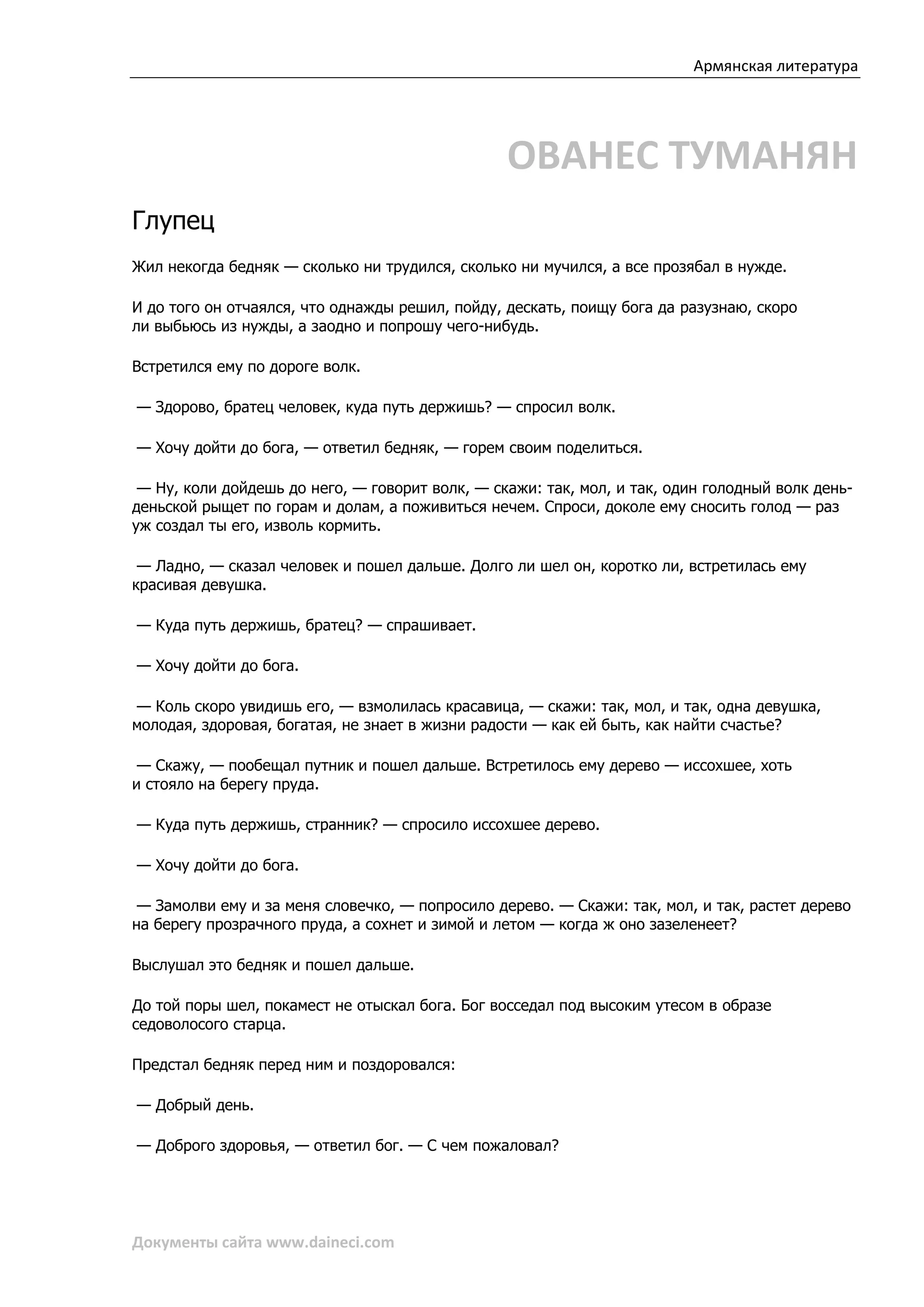 В армянской литературной сказке рассказывается о бедняке, который отправляется искать Бога, чтобы узнать, когда улучшится его жизнь. По пути он встречает волка, красивую девушку и иссохшее дерево, которые просят его донести свои просьбы до Бога. В конце бедняк, игнорируя их обращения и сосредоточенный на своей удаче, становится жертвой волка, который наслаждается его глупостью.