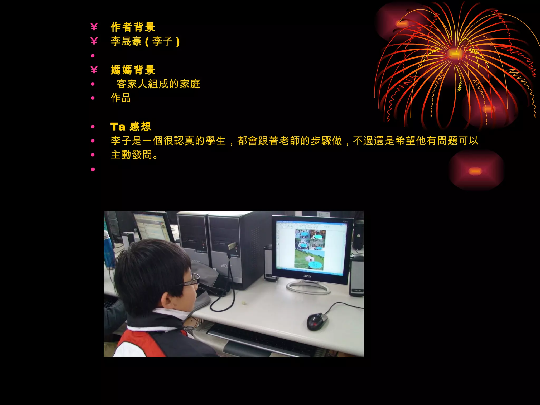 李子 ) 媽媽背景 客家人組成的家庭 作品 Ta 感想 李子是一個很認真的學生,都會跟著老師的步驟做,不過還是希望他有問題可以 主動發問。