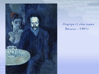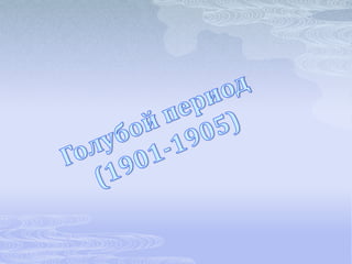 Документ описывает работы Пабло Пикассо, созданные в период с 1901 по 1904 годы, известный как 'голубой период'. В этот период художник акцентировал внимание на темах нищеты, меланхолии и смерти, используя преобладающие синие оттенки и жесткие контуры, что способствовало созданию эмоционального воздействия на зрителя. Упоминается, что депрессивные мотивы возникли после самоубийства его друга Карлоса Касагемаса.