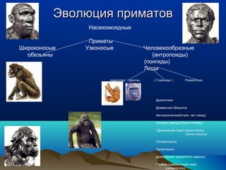 Документ обсуждает происхождение человека, включая эволюцию приматов и доказательства антропогенеза. Он выделяет ключевые этапы развития человека, расовые характеристики, а также влияние социальных и биологических факторов на эволюцию. Также рассматриваются концепции расизма и их научная несостоятельность, подчеркивая равенство всех рас в их эволюционном развитии.