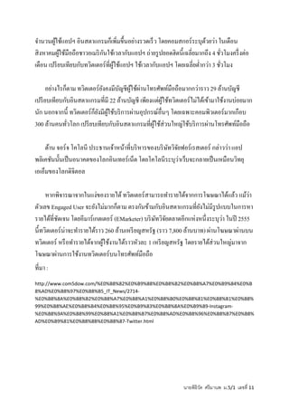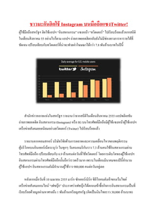 โดยคอมสกอร์ ระบุดวยว่า ในเดือน ้ ้ ้ ั สิ งหาคมผูใช้มือถือชาวอเมริ กนใช้เวลากับแอปฯ ถ่ายรู ปยอดฮิตนี้เฉลี่ยมากถึง 4 ชัวโมงครึ่ งต่อ ่ เดือน เปรี ยบเทียบกับทวิตเตอร์ที่ผใช้แอปฯ ใช้เวลากับแอปฯ โดยเฉลี่ยตํ่ากว่า 3 ชัวโมง ู้ ่ ั ู้ ่ อย่างไรก็ตาม ทวิตเตอร์ยงคงมีบญชีผใช้ผานโทรศัพท์มือถือมากกว่าราว 29 ล้านบัญชี ั เปรี ยบเทียบกับอินสตาแกรมที่มี 22 ล้านบัญชี เพียงแต่ผใช้ทวิตเตอร์ ไม่ได้เข้ามาใช้งานบ่อยมาก ู้ ็ ั ู้ นัก นอกจากนี้ ทวิตเตอร์กยงมีผใช้บริ การผ่านอุปกรณ์อื่นๆ โดยเฉพาะคอมพิวเตอร์ มากเกือบ 300 ล้านคนทัวโลก เปรี ยบเทียบกับอินสตาแกรมที่ผใช้ส่วนใหญ่ใช้บริ การผ่านโทรศัพท์มือถือ ่ ู้ ด้าน จอร์จ โคโลนี ประธานเจ้าหน้าที่บริ หารของบริ ษทวิจยฟอร์ เรสเตอร์ กล่าวว่า แอป ั ั ่ พลิเคชันนั้นเป็ นอนาคตของโลกอินเทอร์ เน็ต โดยโคโลนีระบุวาเว็บจะกลายเป็ นเหมือนวิทยุ เอเอ็มของโลกดิจิตอล หากพิจารณาจากในแง่ของรายได้ ทวิตเตอร์ สามารถทํารายได้จากการโฆษณาได้แล้ว แม้วา ่ ตัวเลข Engaged User จะยังไม่มากก็ตาม ตรงกันข้ามกับอินสตาแกรมที่ยงไม่มีรูปแบบในการหา ั ั ั ั ่ รายได้ที่ชดเจน โดยอีมาร์เกตเตอร์ (EMarketer) บริ ษทวิจยตลาดอีกแห่งหนึ่ งระบุวา ในปี 2555 นี้ทวิตเตอร์ น่าจะทํารายได้ราว 260 ล้านเหรี ยญสหรัฐ (ราว 7,800 ล้านบาท) ผ่านโฆษณาผ่านบน ทวิตเตอร์ หรื อทํารายได้จากผูใช้งานได้ราวหัวละ 1 เหรี ยญสหรัฐ โดยรายได้ส่วนใหญ่มาจาก ้ โฆษณาผ่านการใช้งานทวิตเตอร์บนโทรศัพท์มือถือ ที่มา : http://www.com5dow.com/%E0%B8%82%E0%B9%88%E0%B8%B2%E0%B8%A7%E0%B9%84%E0%B 8%AD%E0%B8%97%E0%B8%B5_IT_News/2714‐ %E0%B8%8A%E0%B8%B2%E0%B8%A7%E0%B8%A1%E0%B8%B0%E0%B8%81%E0%B8%B1%E0%B8% 99%E0%B8%AE%E0%B8%B4%E0%B8%95%E0%B9%83%E0%B8%8A%E0%B9%89‐Instagram‐ %E0%B8%9A%E0%B8%99%E0%B8%A1%E0%B8%B7%E0%B8%AD%E0%B8%96%E0%B8%B7%E0%B8% AD%E0%B9%81%E0%B8%8B%E0%B8%87‐Twitter.html นายพิธิวต ศรี มานพ ม.5/1 เลขที่ 11 ั