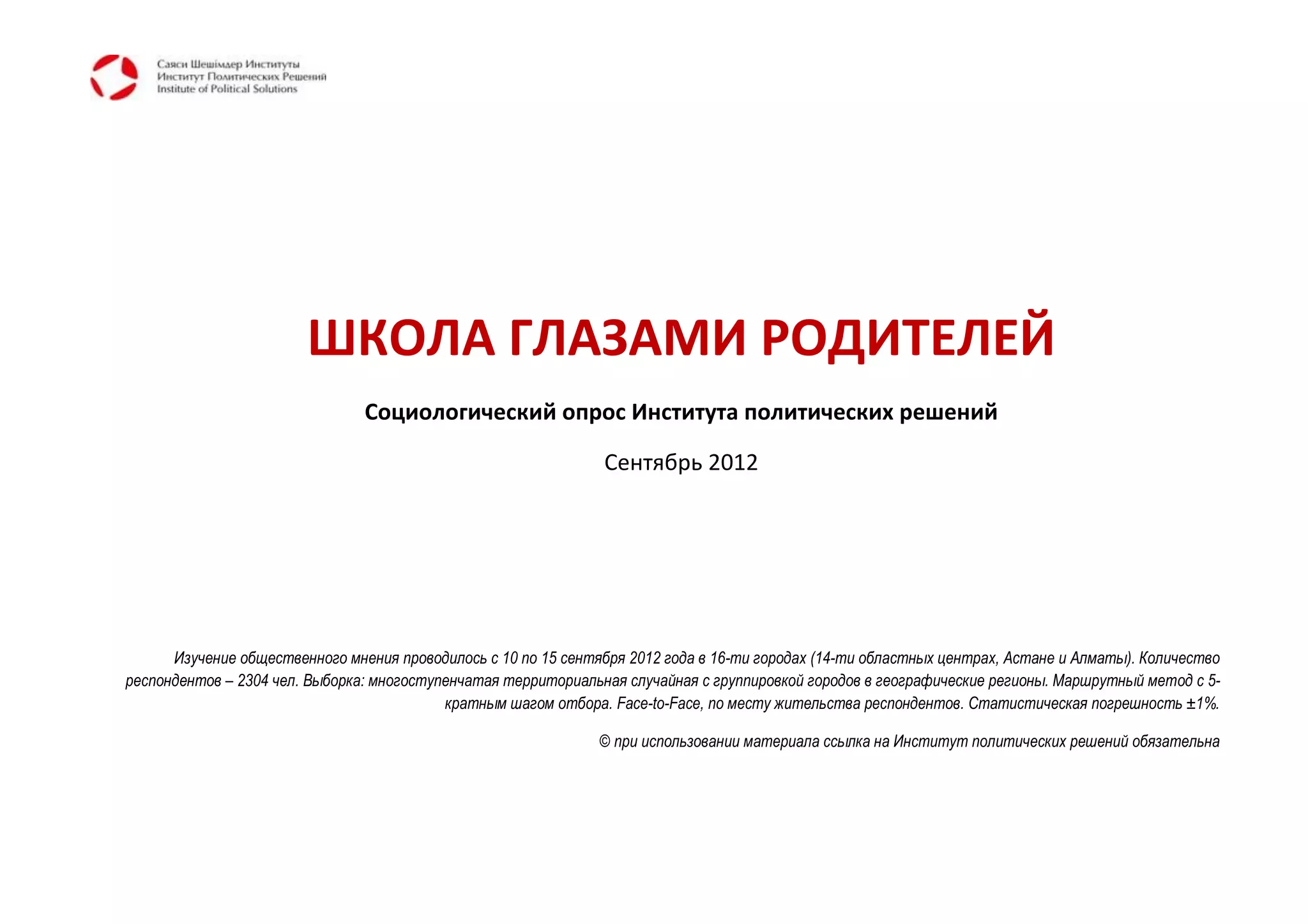 Социологический опрос, проведенный в сентябре 2012 года в 16 городах Казахстана, показал, что 45,6% респондентов имеют детей школьного возраста. Преобладающее большинство школьников обучаются в государственных школах, при этом 80,2% родителей довольны тем, как их детям нравится учиться. Основные тревоги родителей связаны с расходами на обучение и качеством образования.