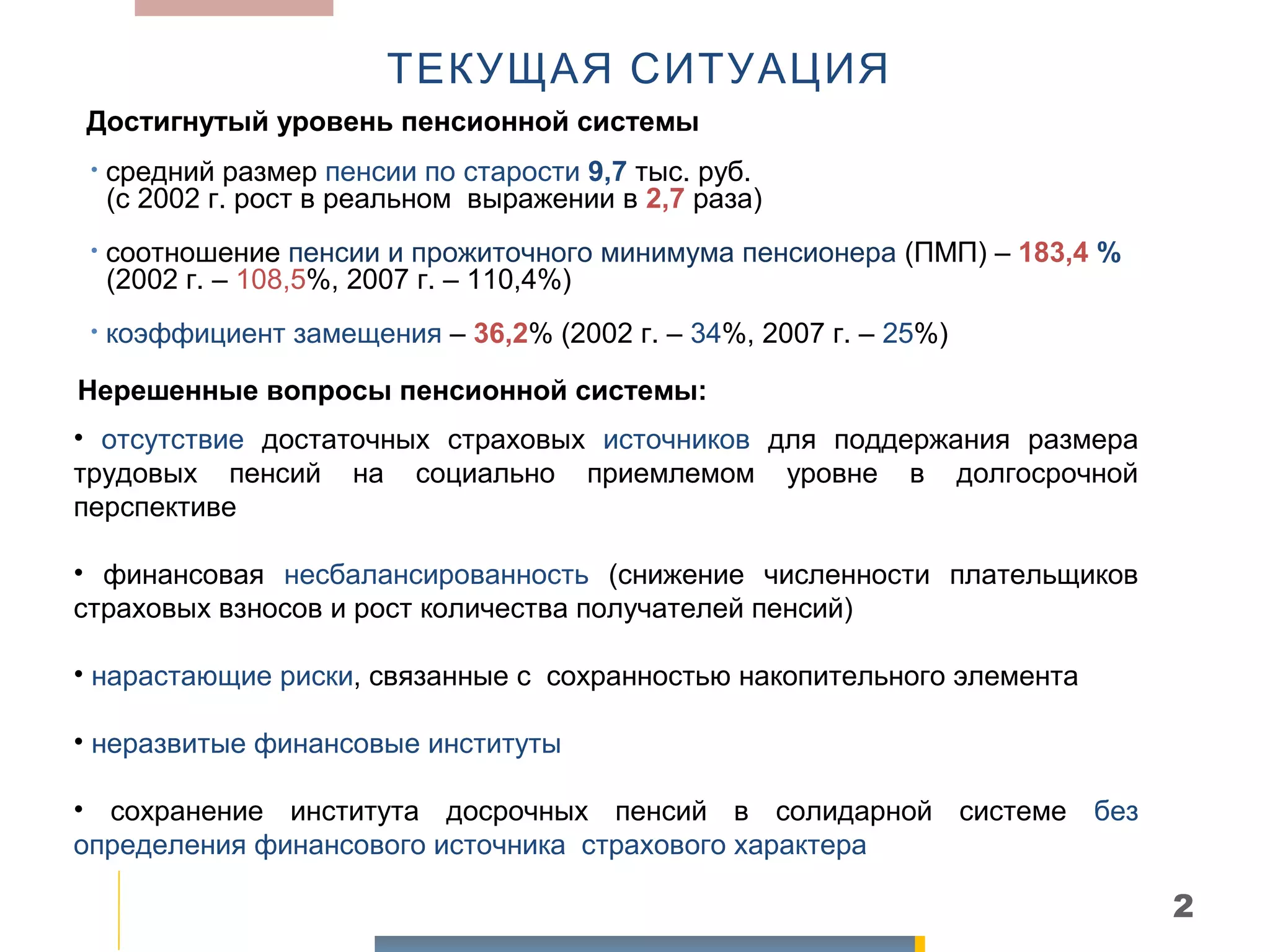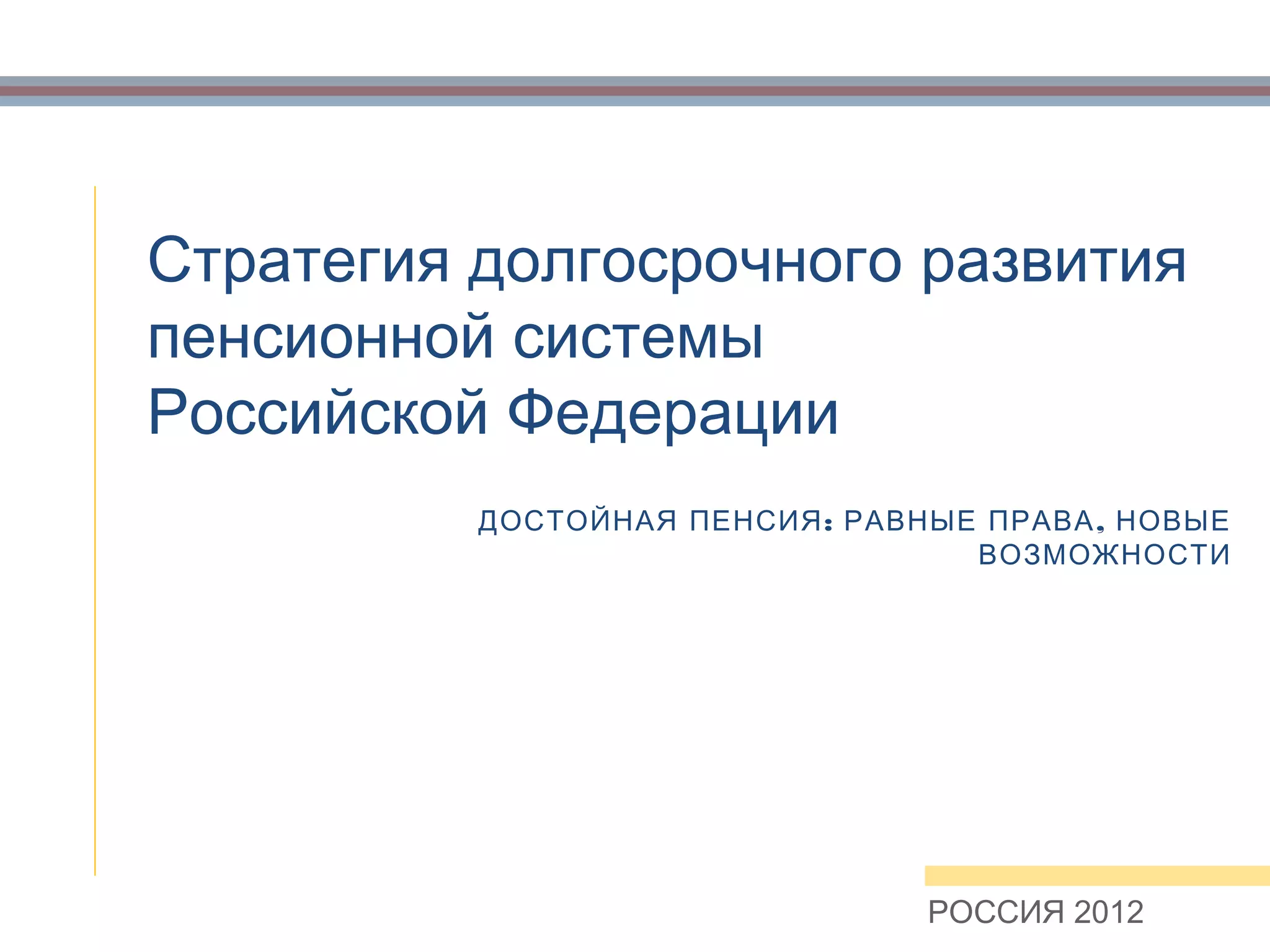 Документ описывает стратегию долгосрочного развития пенсионной системы России, подчеркивая достигнутые результаты и проблемы, включая финансовую несбалансированность и недостаток источников пенсионного обеспечения. Прогнозируется увеличение числа пенсионеров и снижение работников, что ставит под вопрос устойчивость выплат. Основные задачи реформирования включают обеспечение финансовой стабильности и создание трехуровневой модели пенсионной системы.
