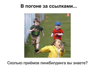 Документ описывает различные методы линкбилдинга, выделяя 101 метод, но акцентируясь на четырех основных подходах. Обсуждаются как платные, так и бесплатные способы получения ссылок, включая различные сервисы, такие как LinkFeed и LinkToLink. Дополнительно представлены советы по поиску dofollow блогов и форумов для создания ссылок.