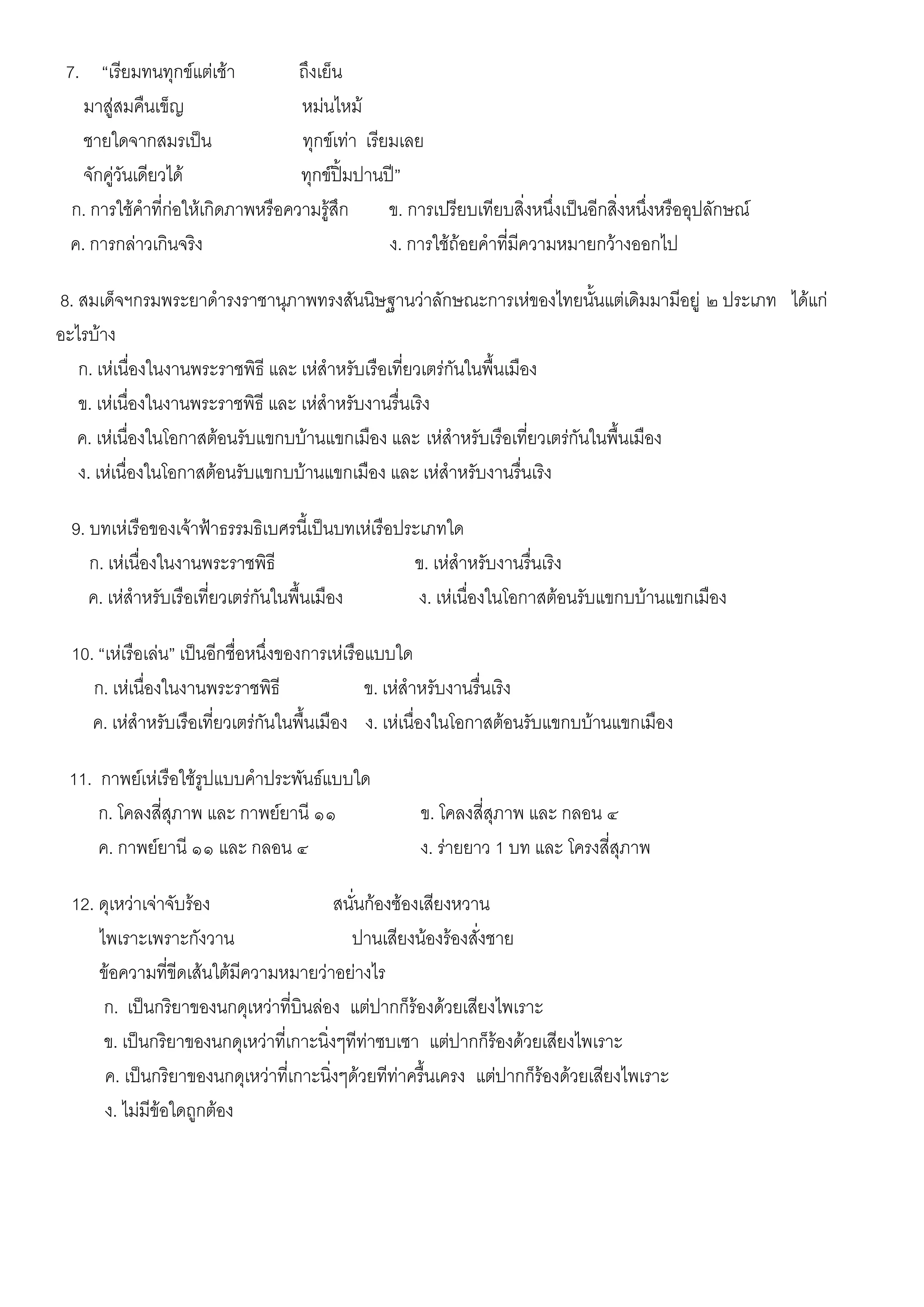 ถึงเย็น มาสู่สมคืนเข็ญ หม่นไหม้ ชายใดจากสมรเป็น ทุกข์เท่า เรียมเลย จักคู่วันเดียวได้ ทุกข์ปิ้มปานปี” ก. การใช้คาที่ก่อให้เกิดภาพหรือความรู้สึก ข. การเปรียบเทียบสิ่งหนึ่งเป็นอีกสิ่งหนึ่งหรืออุปลักษณ์ ค. การกล่าวเกินจริง ง. การใช้ถ้อยคาที่มีความหมายกว้างออกไป 8. สมเด็จฯกรมพระยาดารงราชานุภาพทรงสันนิษฐานว่าลักษณะการเห่ของไทยนั้นแต่เดิมมามีอยู่ ๒ ประเภท ได้แก่ อะไรบ้าง ก. เห่เนื่องในงานพระราชพิธี และ เห่สาหรับเรือเที่ยวเตร่กันในพื้นเมือง ข. เห่เนื่องในงานพระราชพิธี และ เห่สาหรับงานรื่นเริง ค. เห่เนื่องในโอกาสต้อนรับแขกบบ้านแขกเมือง และ เห่สาหรับเรือเที่ยวเตร่กันในพื้นเมือง ง. เห่เนื่องในโอกาสต้อนรับแขกบบ้านแขกเมือง และ เห่สาหรับงานรื่นเริง 9. บทเห่เรือของเจ้าฟ้าธรรมธิเบศรนี้เป็นบทเห่เรือประเภทใด ก. เห่เนื่องในงานพระราชพิธี ข. เห่สาหรับงานรื่นเริง ค. เห่สาหรับเรือเที่ยวเตร่กันในพื้นเมือง ง. เห่เนื่องในโอกาสต้อนรับแขกบบ้านแขกเมือง 10. “เห่เรือเล่น” เป็นอีกชื่อหนึ่งของการเห่เรือแบบใด ก. เห่เนื่องในงานพระราชพิธี ข. เห่สาหรับงานรื่นเริง ค. เห่สาหรับเรือเที่ยวเตร่กันในพื้นเมือง ง. เห่เนื่องในโอกาสต้อนรับแขกบบ้านแขกเมือง 11. กาพย์เห่เรือใช้รูปแบบคาประพันธ์แบบใด ก. โคลงสี่สุภาพ และ กาพย์ยานี ๑๑ ข. โคลงสี่สุภาพ และ กลอน ๔ ค. กาพย์ยานี ๑๑ และ กลอน ๔ ง. ร่ายยาว 1 บท และ โครงสี่สุภาพ 12. ดุเหว่าเจ่าจับร้อง สนั่นก้องซ้องเสียงหวาน ไพเราะเพราะกังวาน ปานเสียงน้องร้องสั่งชาย ข้อความที่ขีดเส้นใต้มีความหมายว่าอย่างไร ก. เป็นกริยาของนกดุเหว่าที่บินล่อง แต่ปากก็ร้องด้วยเสียงไพเราะ ข. เป็นกริยาของนกดุเหว่าที่เกาะนิ่งๆทีท่าซบเซา แต่ปากก็ร้องด้วยเสียงไพเราะ ค. เป็นกริยาของนกดุเหว่าที่เกาะนิ่งๆด้วยทีท่าครื้นเครง แต่ปากก็ร้องด้วยเสียงไพเราะ ง. ไม่มีข้อใดถูกต้อง